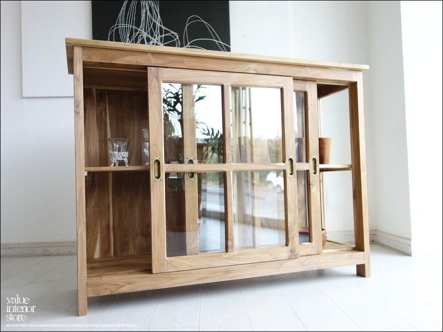 チーク総無垢材で贅沢に仕上げた使い勝手の良いスライド扉ガラスキャビネット。