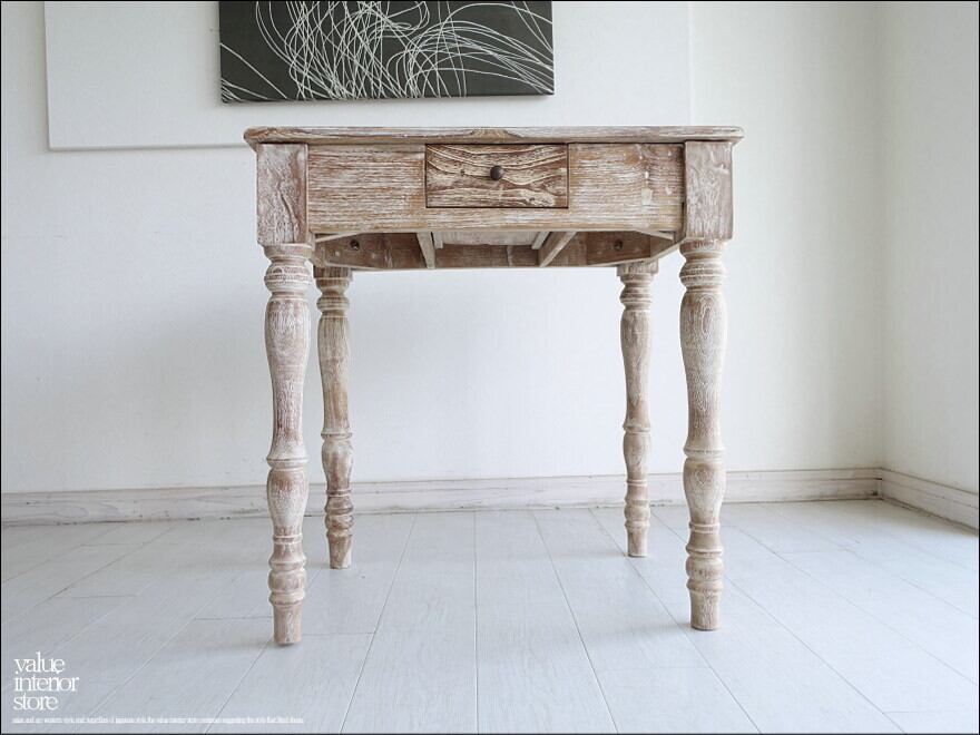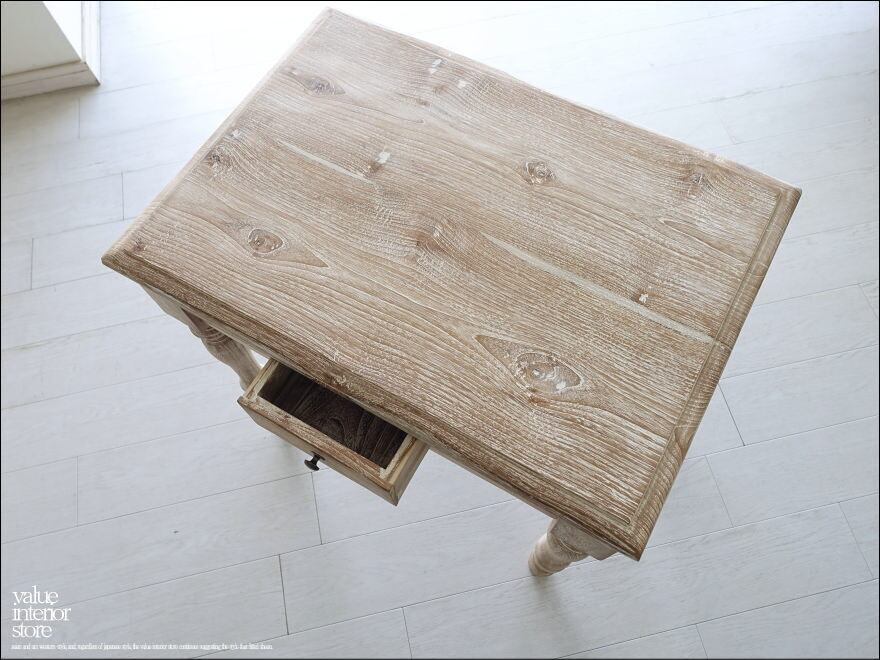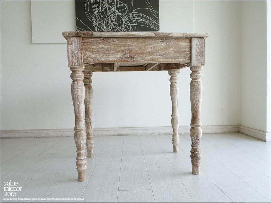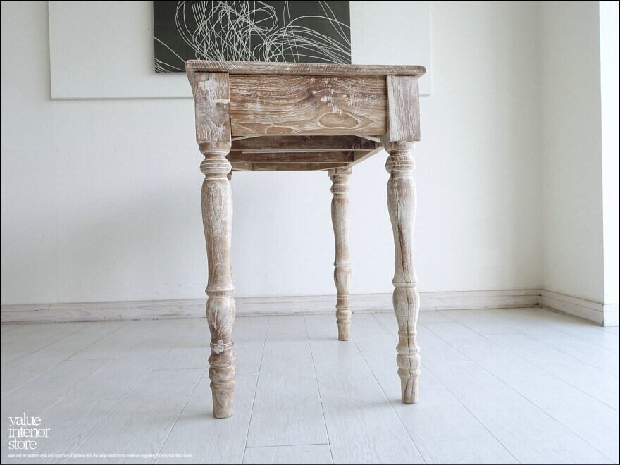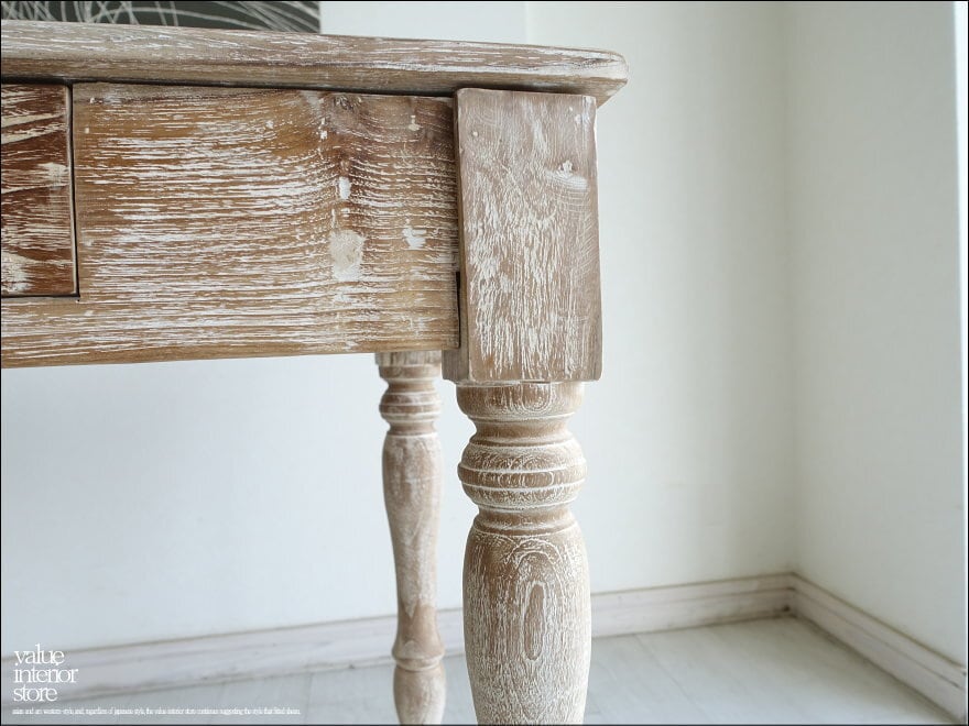 表面はワイヤーブラシで軽く削ってから白色を塗布した後に、紙やすりで再度表面を削る手法を用いていますので、シャビーな質感に仕上がっています。西洋、アジアン、和風モダン、北欧など幅広いテイストのインテリアと相性良くコーディネートできますのでお気に入りスペースでお使いください。