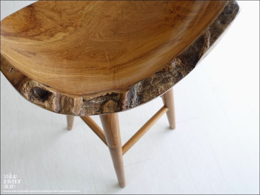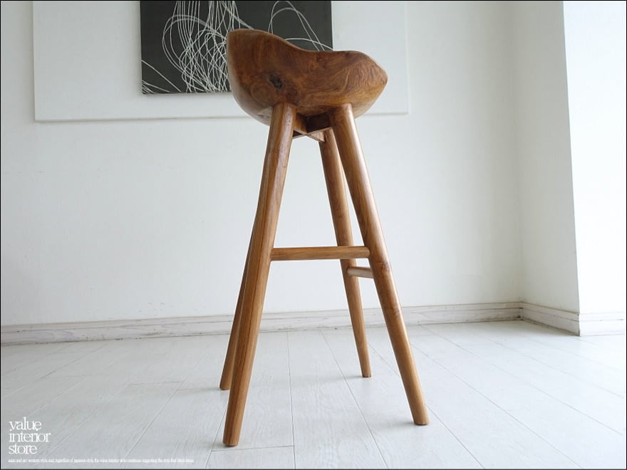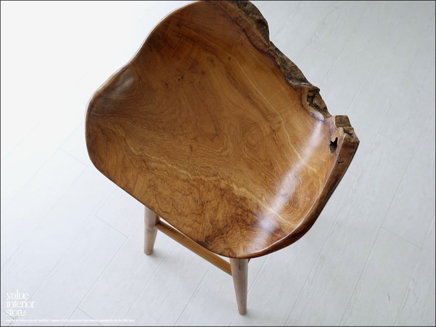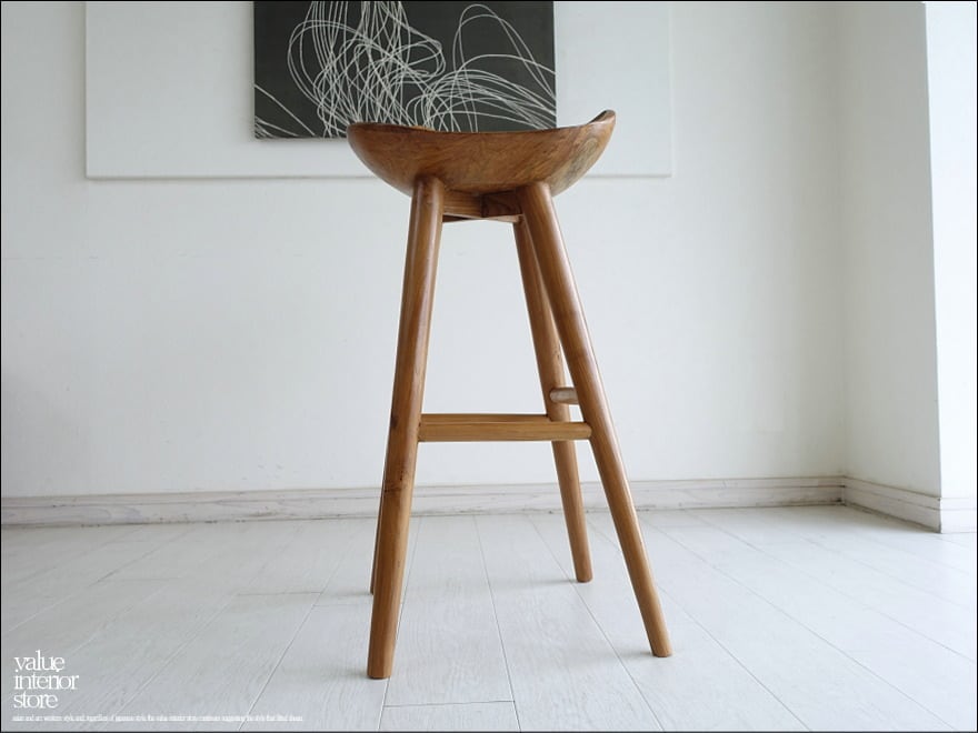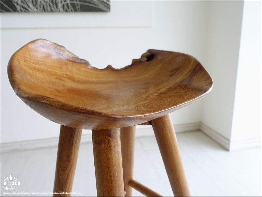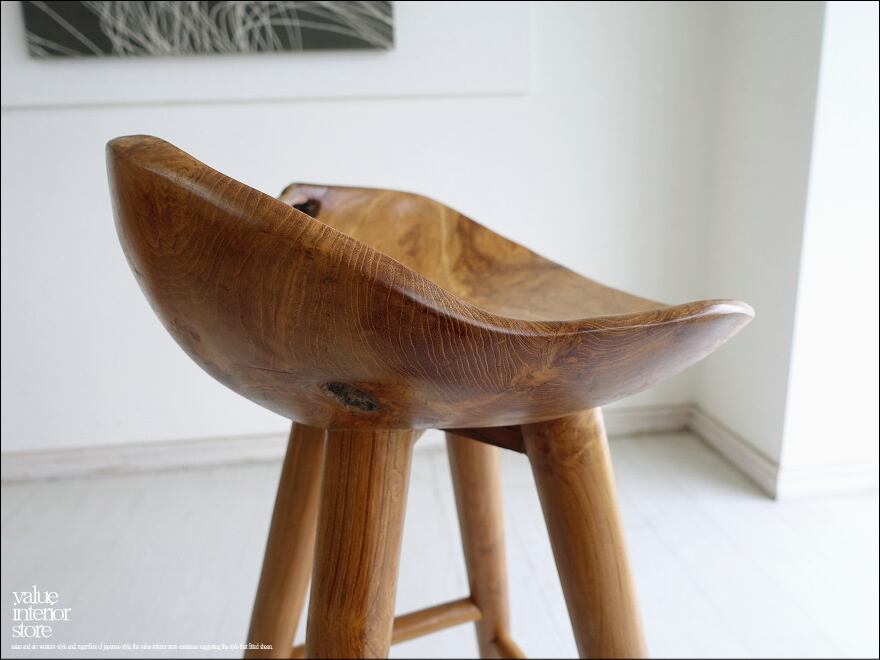プリミティブな座面が何とも印象的なチーク総無垢材のバースツール。一つ一つ変化に富んだ木肌も素敵です。おしりを包み込むようにホールドしてくれるような座面の形は座り心地も良くお勧めです。