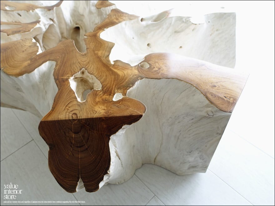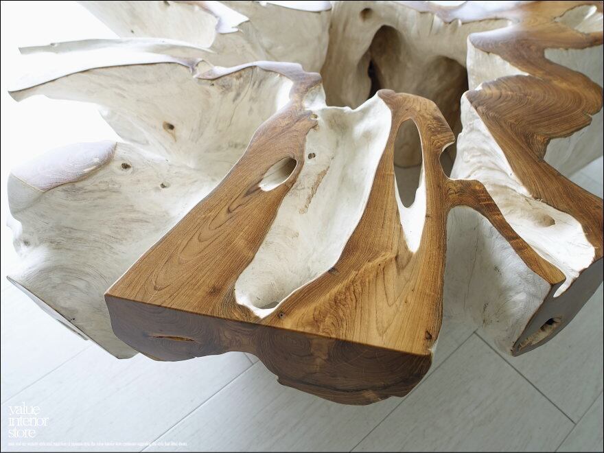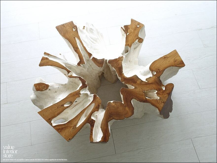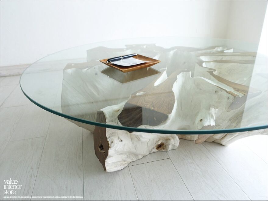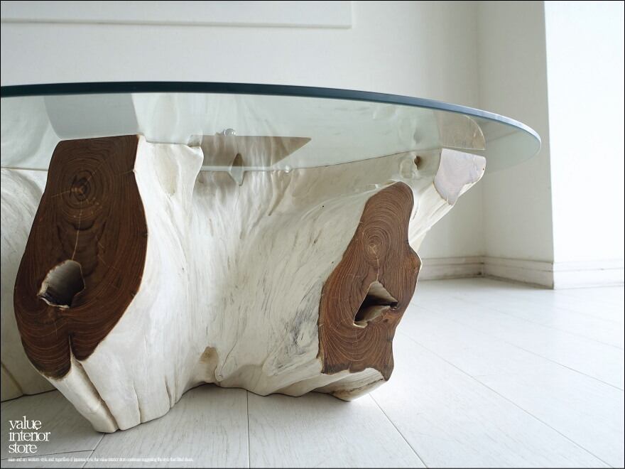 チークの根本をテーブルに使った何ともプリミティブなガラステーブル。