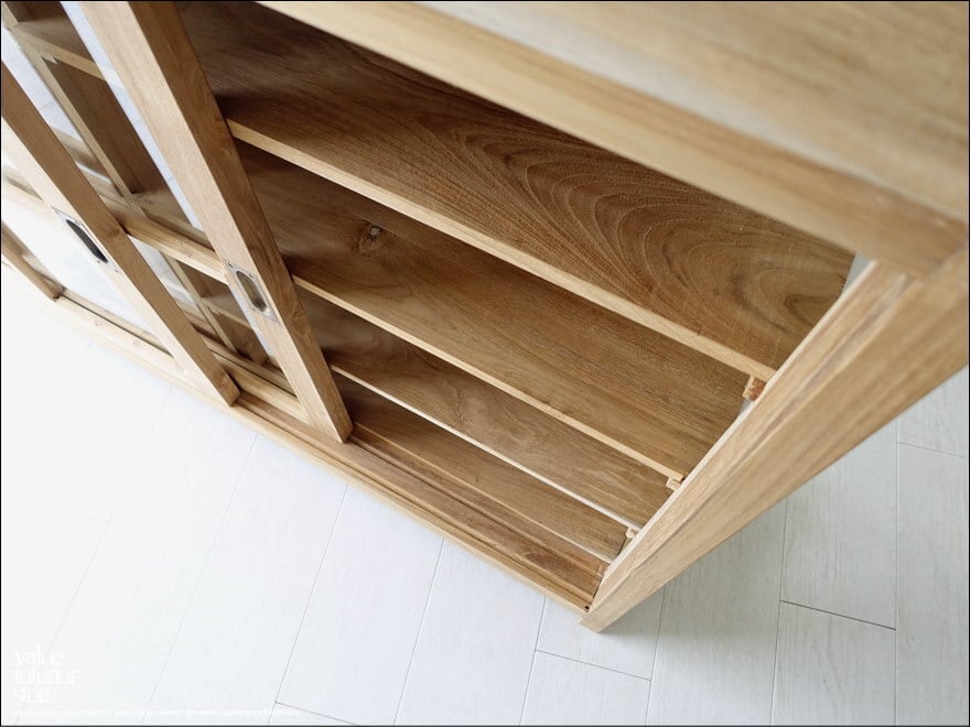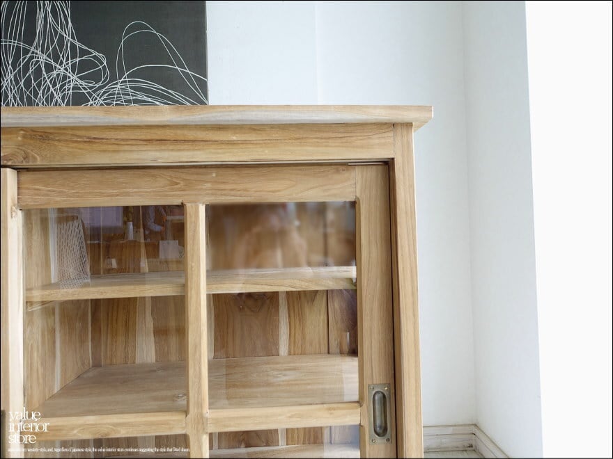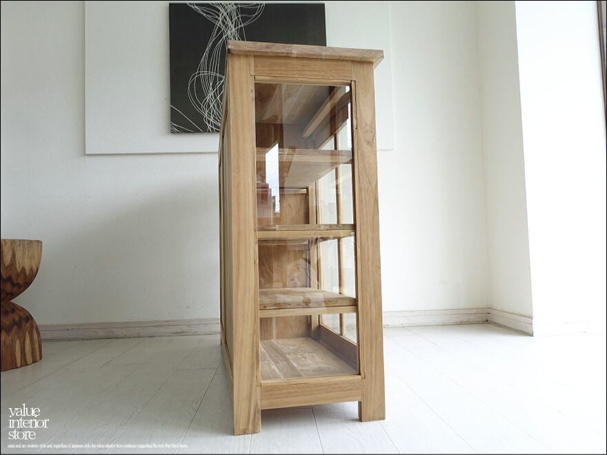 チーク総無垢材で贅沢に仕上げた使い勝手の良いスライド扉ガラスキャビネット。