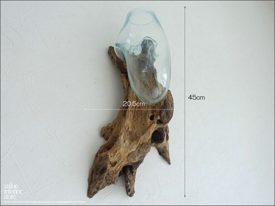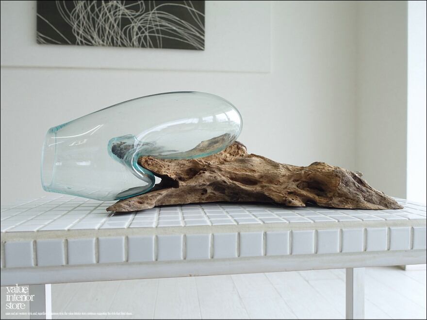 プリミティブな無垢材の土台に吹きガラスを合わせたフラワーベース。一点一点手作りで同じ形のものはなく、どちらの素材も大変個性的で味があります。主役のお花を一層引き立たせてくれます。
