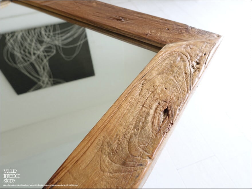 オールドチークならではの味わい深い木目が存分に生かされた厚めのフレームが印象的なミラー。