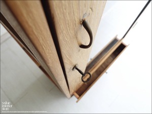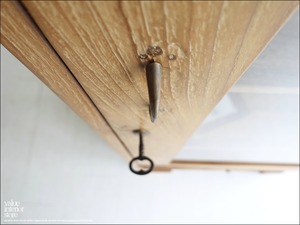 存在感のある大きさで奥行きもたっぷりあるのでキッチンの食器棚としてもリビングの収納棚としても便利にお使いいただけます。扉はガラスなのでディスプレイするような感覚で中に入れるものにもこだわりたくなります。扉は真鍮鍵付き。鍵がとても可愛らしく、きちんと機能しています。全体的に素朴で落ち着いた色合いでシックな雰囲気を残した表面処理(ワイヤーブラシで表面を削るラスティック仕上げ)になっています。カフェやショップなどの什器として食器棚、本棚、収納棚などにもおすすめです。
