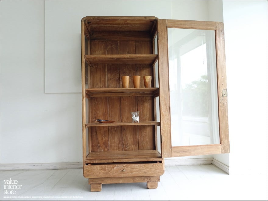 チーク無垢材 ヴィンテージキャビネットXX 食器棚 ショーケース 陳列棚 什器 アンティーク飾り棚 再生家具 表面再仕上 三大銘木 H163cm