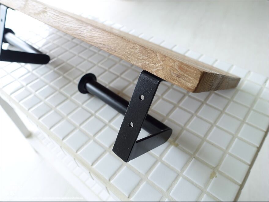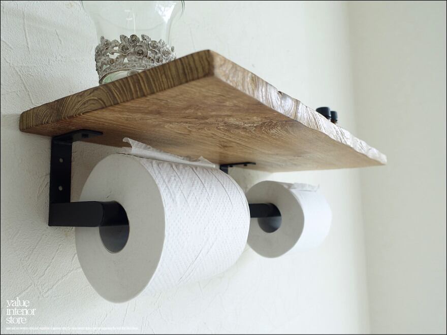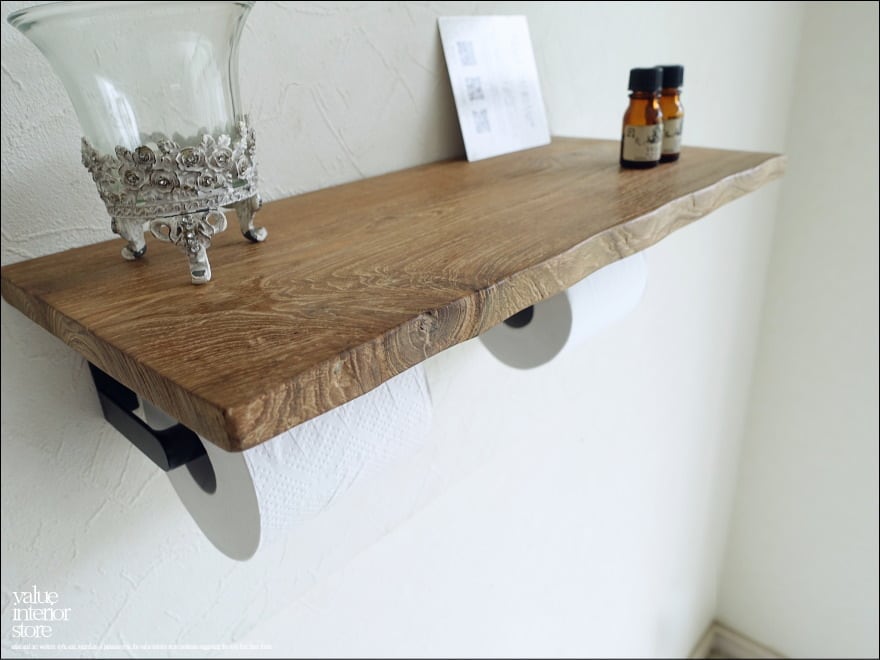 プリミティブなチーク無垢の棚板のついたトイレットペーパーホルダー。板の厚みも十分にあり、どっしりと存在感があります。2つのペーパーを設置でき、ペーパーは横からサッと通すだけの簡単セットなので便利ですよ。棚板にはお気に入りのインテリア小物やグリーンなどを飾ると素敵です。プライベートルームにもこだわりのインテリアをぜひこの機会にどうぞ。