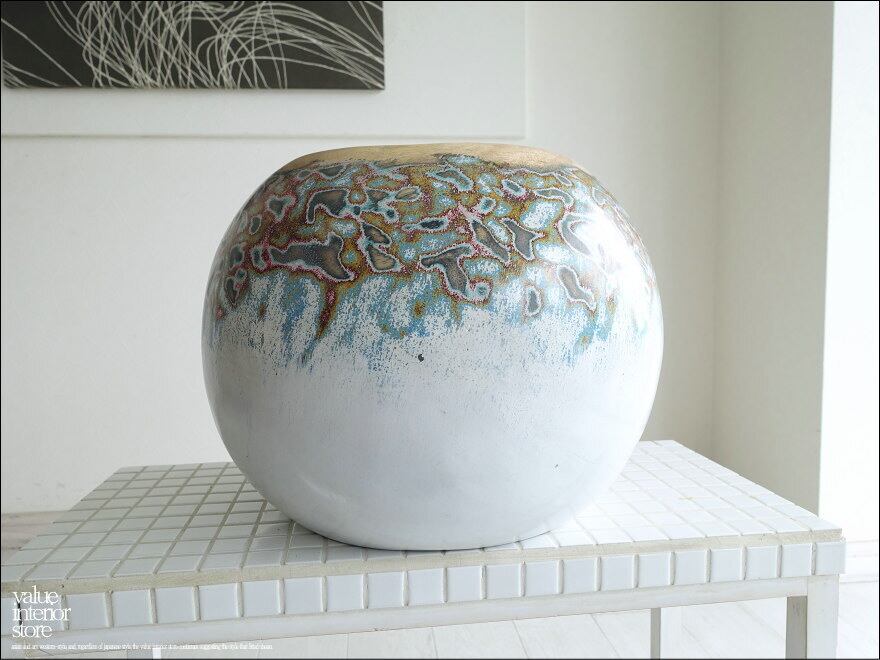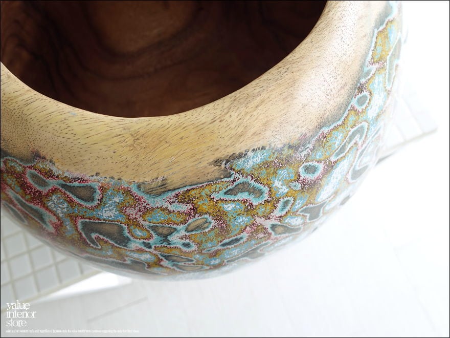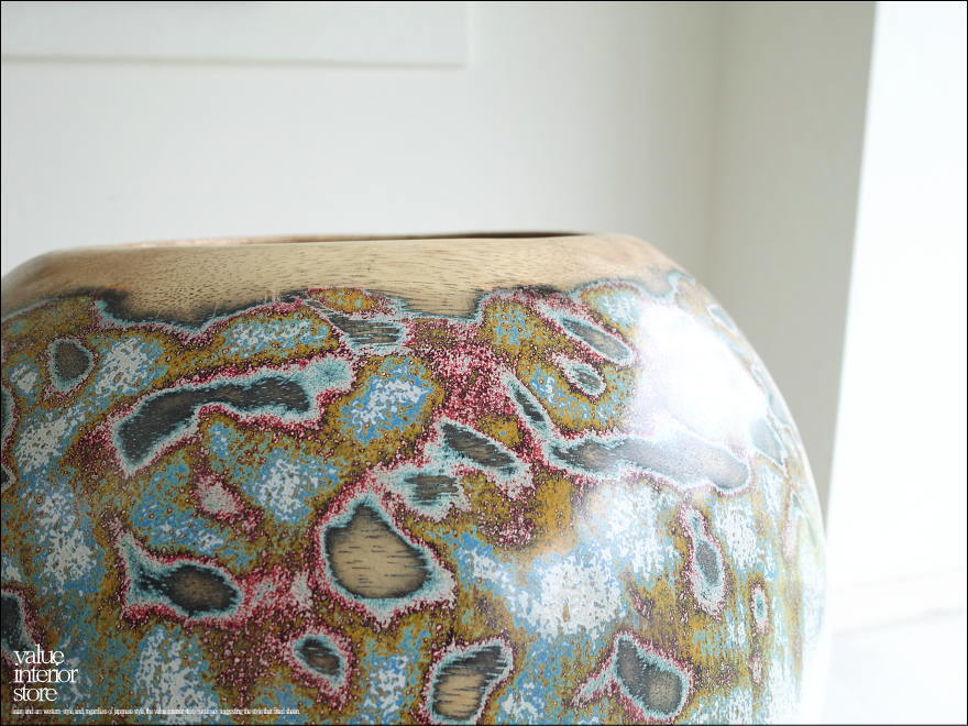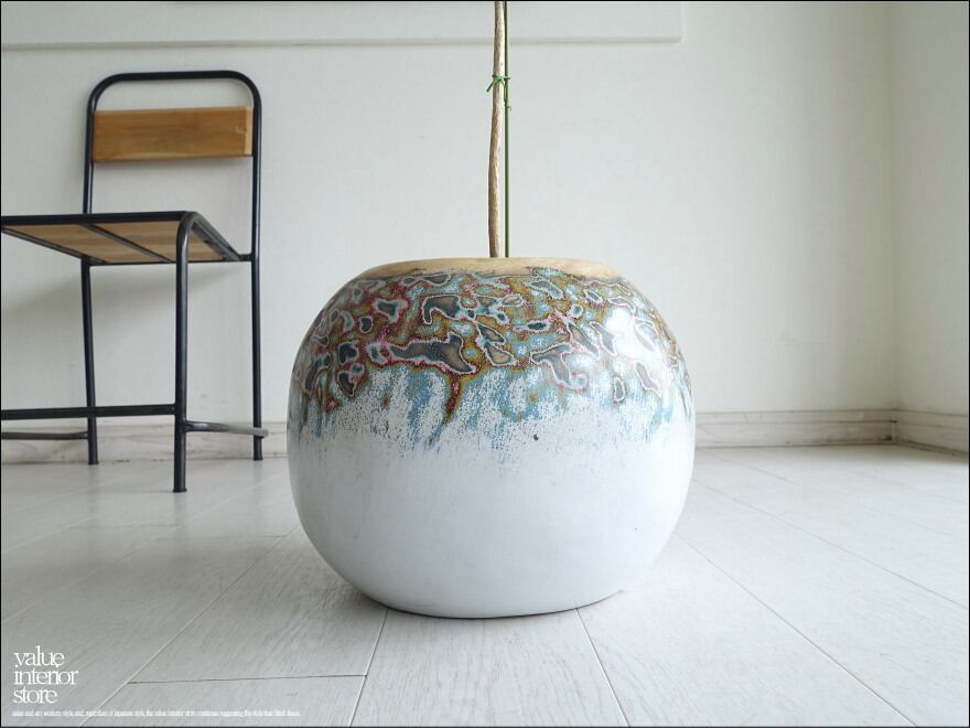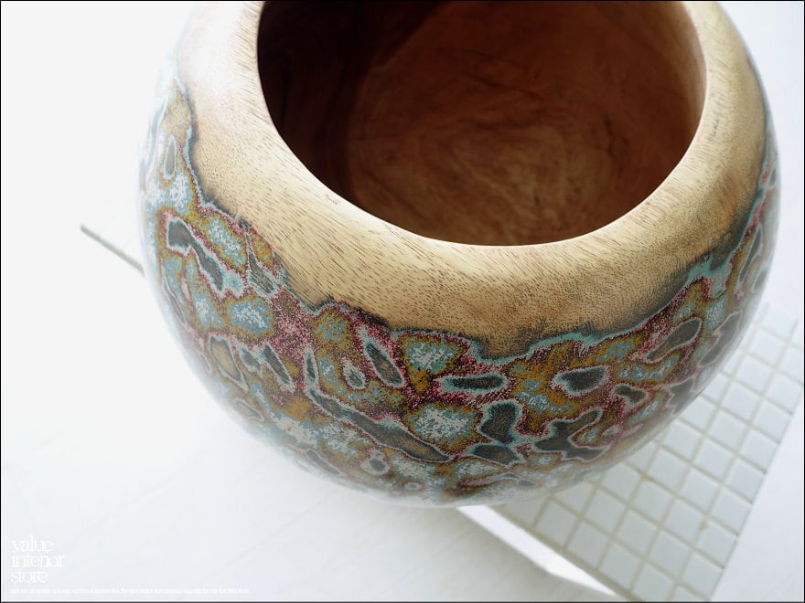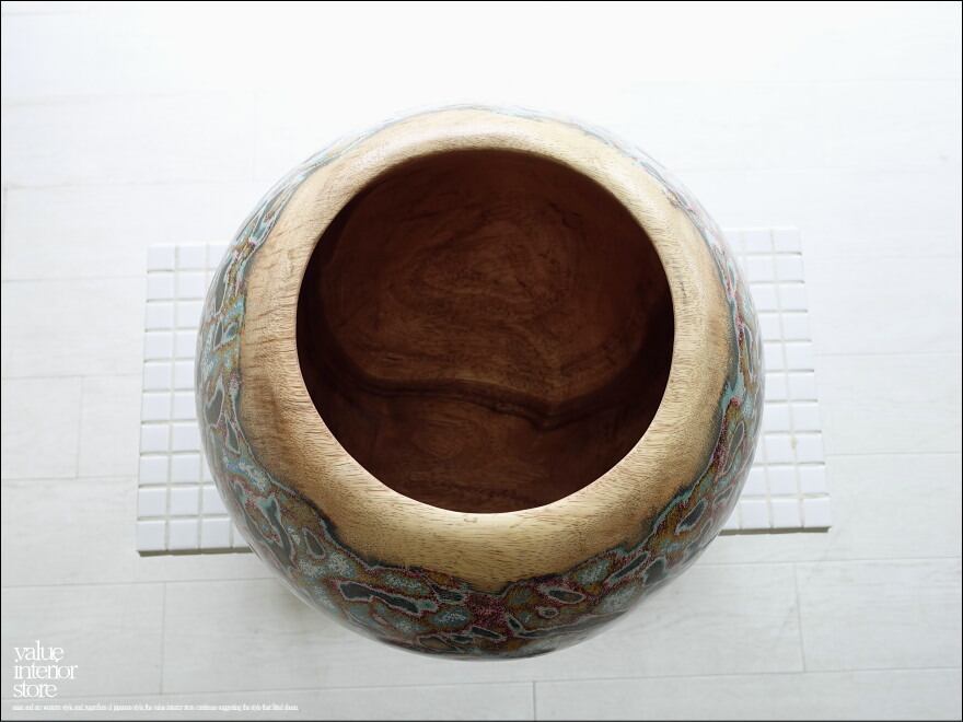 味のある木目と独特のカラーに塗られた色合いが魅力的なウッドポットです。コロンと可愛い形が魅力です。