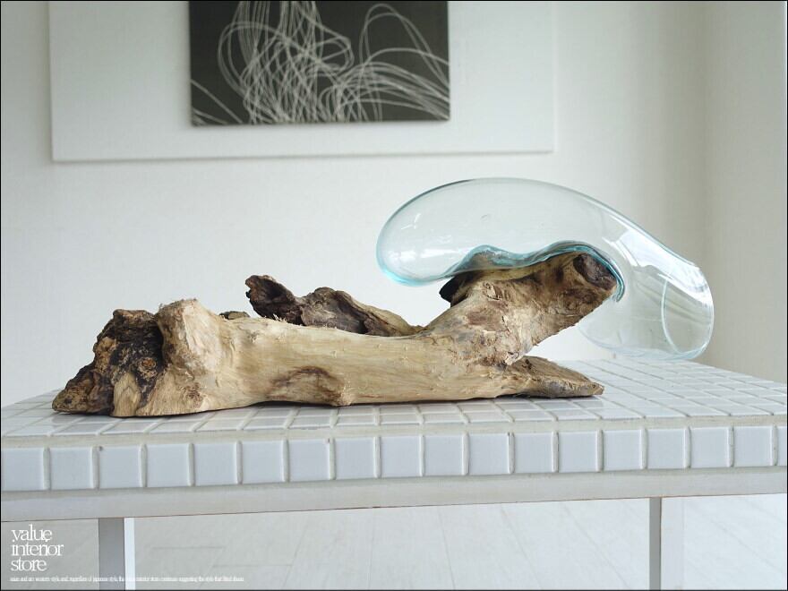プリミティブな無垢材の土台に吹きガラスを合わせたフラワーベース。一点一点手作りで同じ形のものはなく、どちらの素材も大変個性的で味があります。主役のお花を一層引き立たせてくれます。