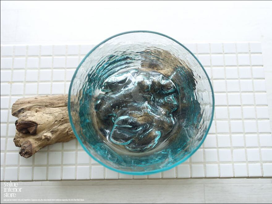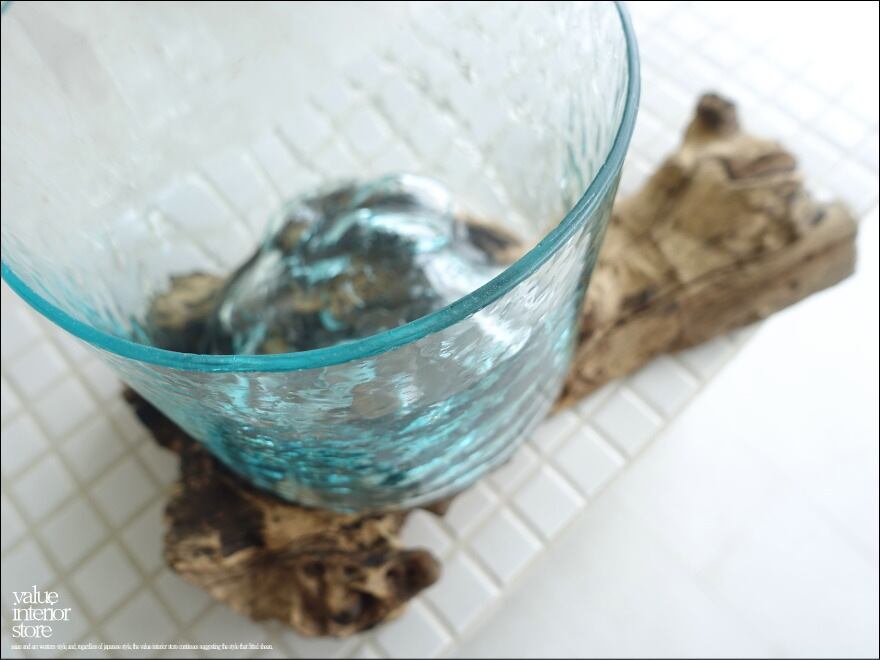 プリミティブな無垢材の土台に吹きガラスを合わせたフラワーベース。メダカ鉢にも良いサイズです。同じ形のものはなく、どちらの素材も大変個性的で味があります。