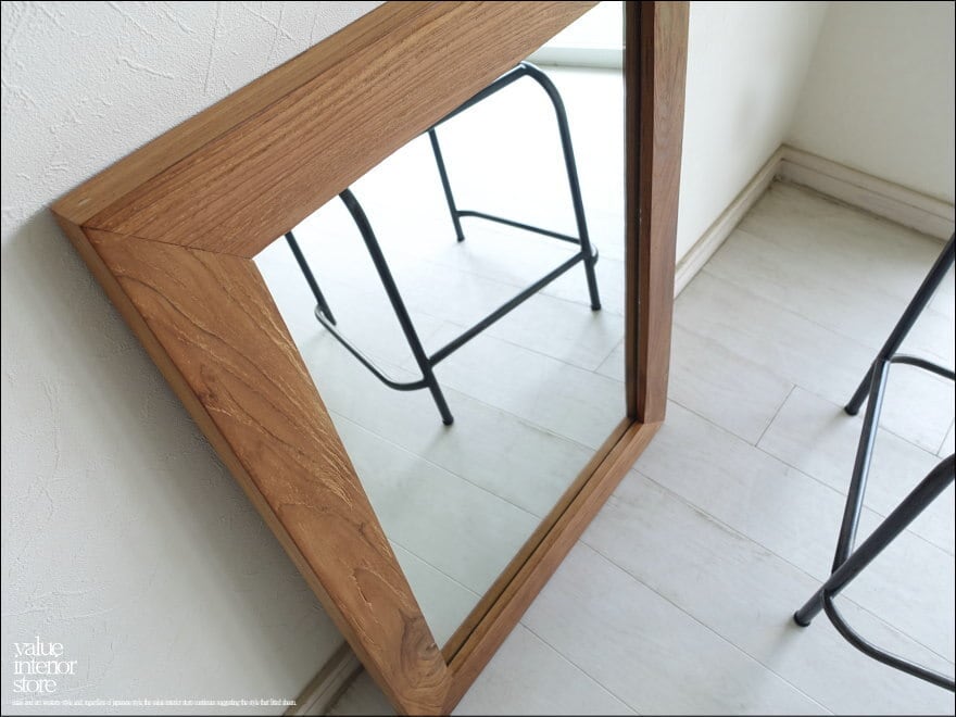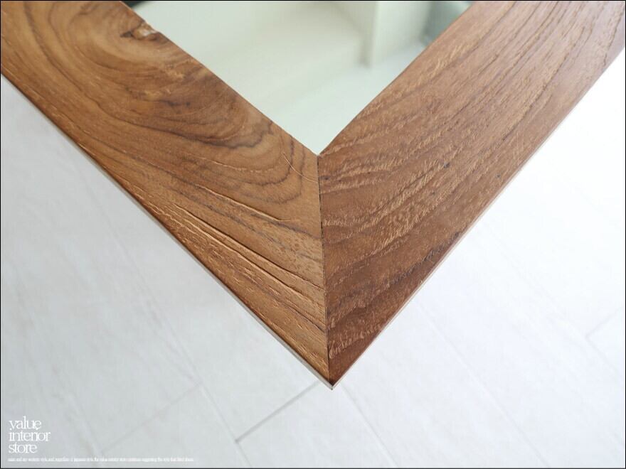 オールドチークならではの味わい深い木目が存分に生かされた厚めのフレームが印象的なミラー。