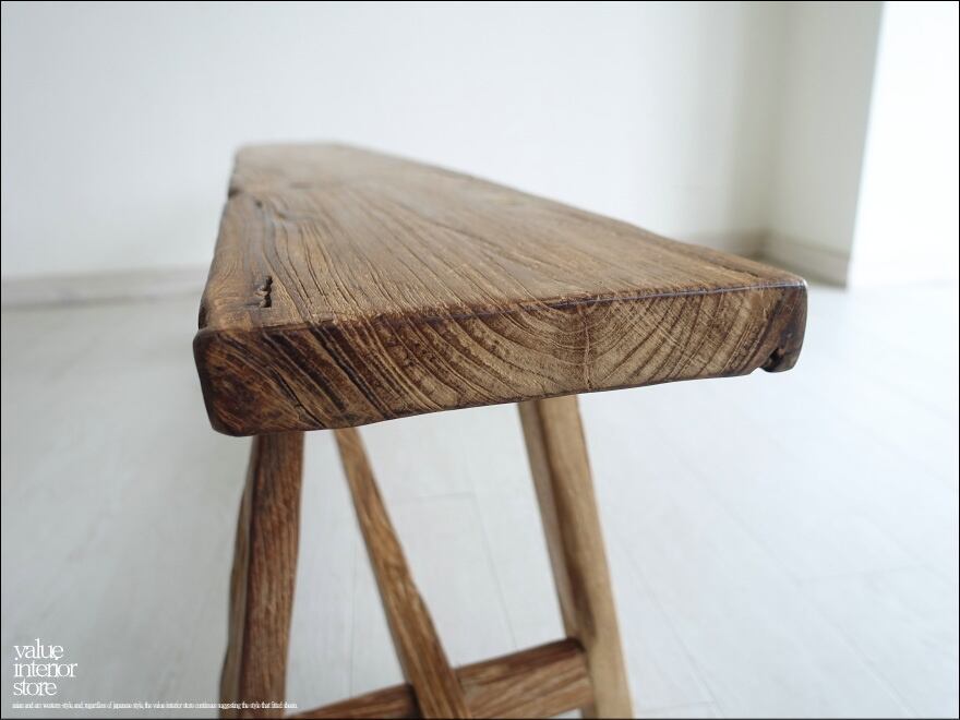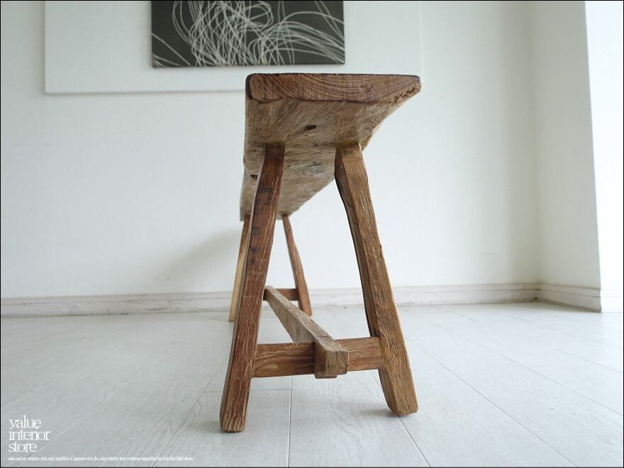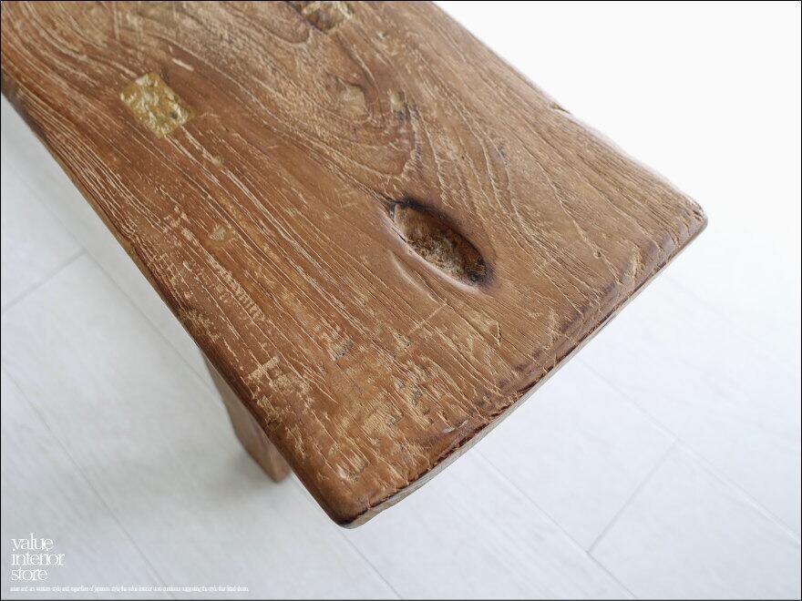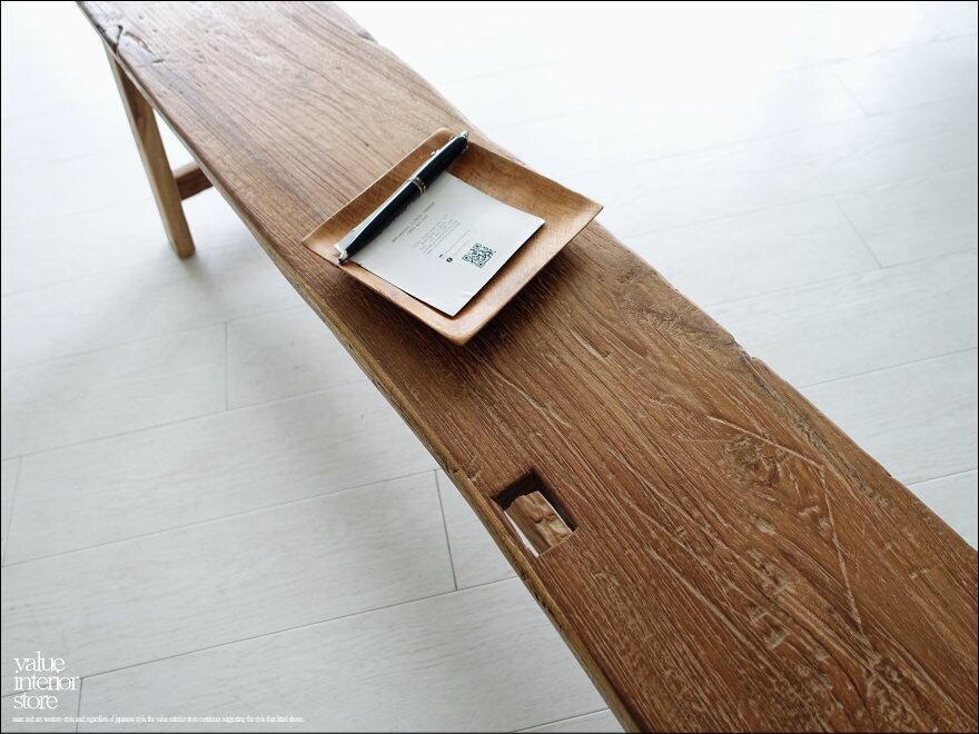 オールドチークならではの味のある雰囲気が魅力のベンチ。一枚板の座面は厚みもあり長くお使いいただけるしっかりした作りです。チークならではの荒々しさと、古材ならではの変化に富んだ木肌が全体的に見られ味わい深く仕上がっています。職人さんが丹精こめて作った印象に溢れていて、きっとお部屋をスローダウンした素敵な雰囲気に包んでくれます。ベンチだけでなくインテリアのディスプレイ台としてもステキです。