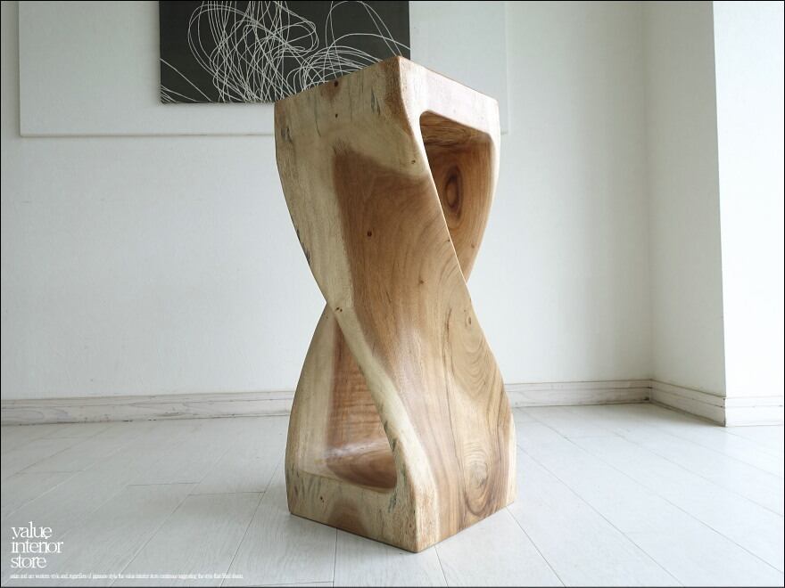 緩やかな螺旋の曲線が優しい印象のモンキーポッド総無垢材のバースツール。ナチュラルな雰囲気で幅広いテイストに合わせやすく設置しやすいスツール。スツール以外にも花台やディスプレイ台としてもお勧めです。お気に入りの空間でぜひお使い下さい。