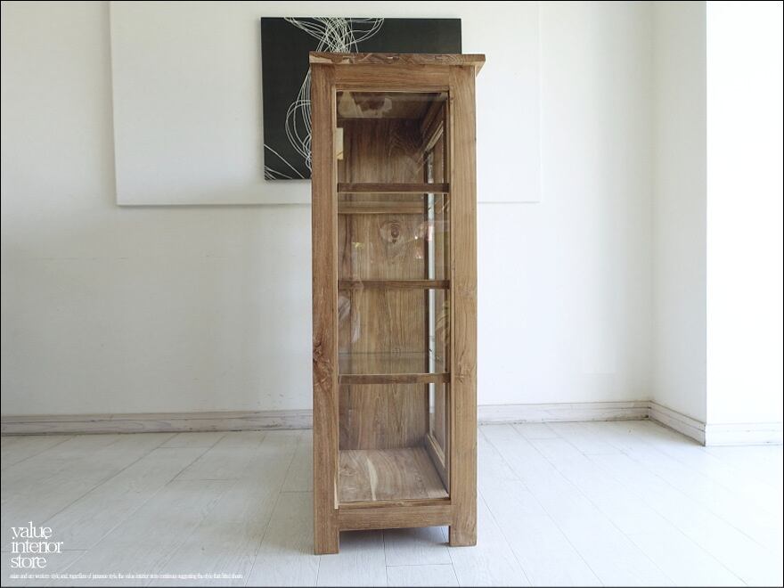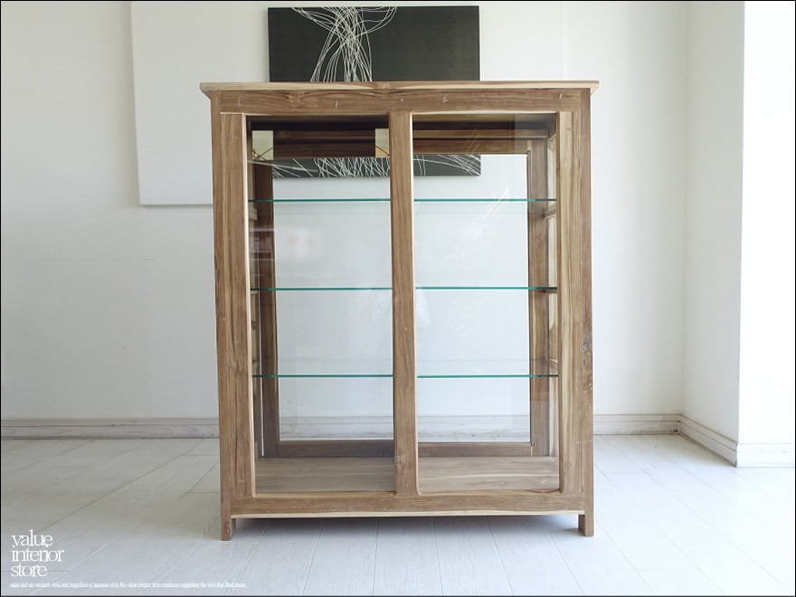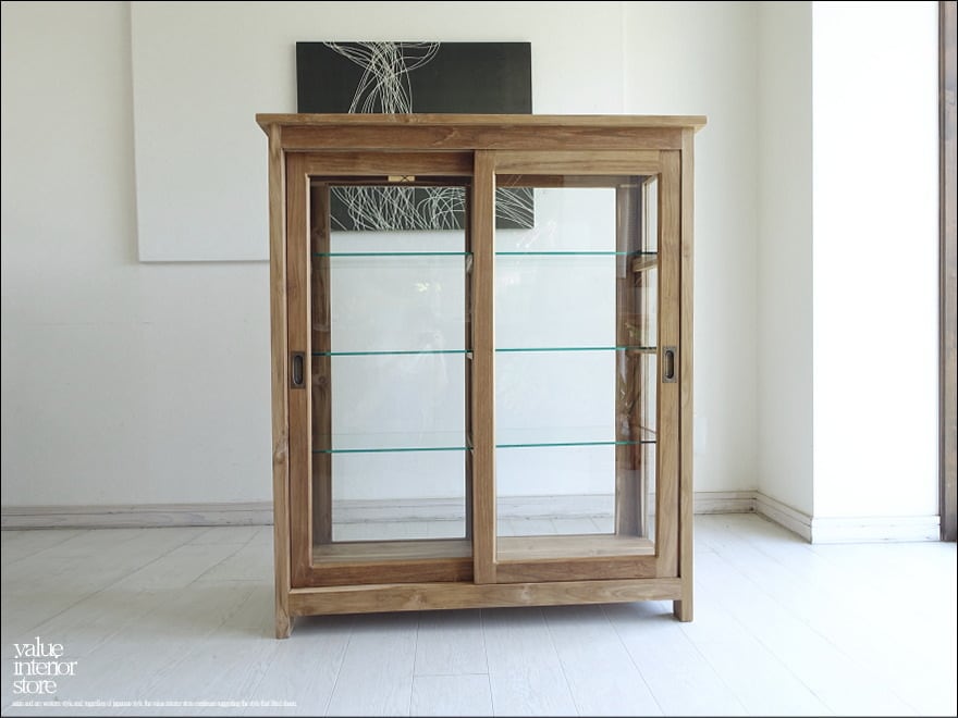チーク総無垢材で贅沢に仕上げた使い勝手の良いスライド扉ガラスキャビネット。