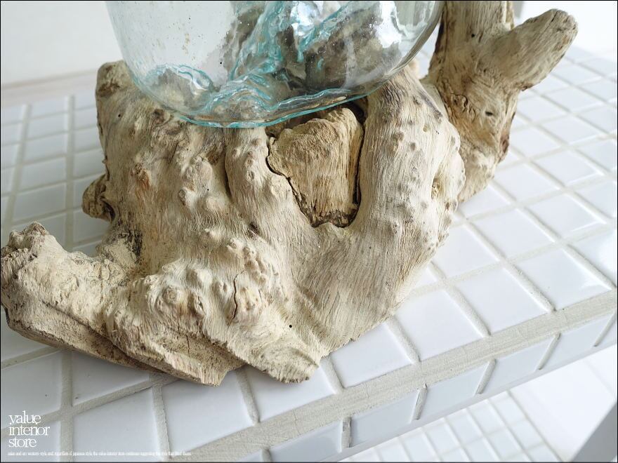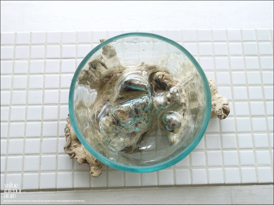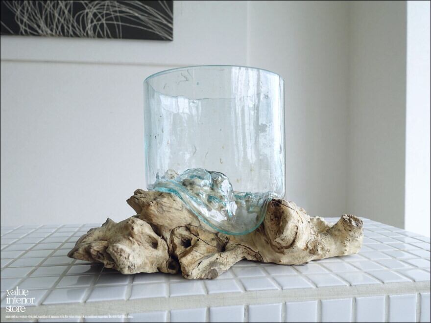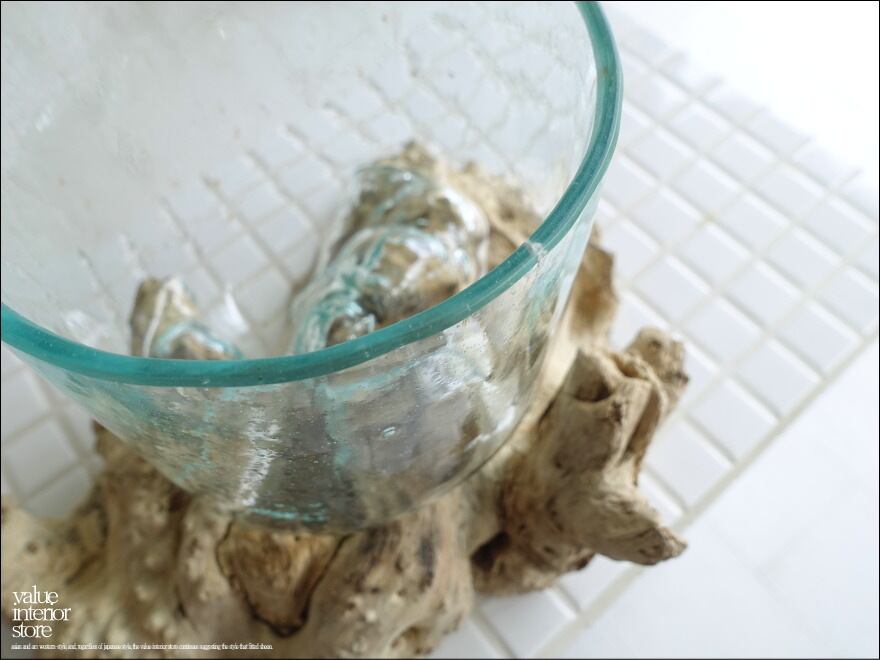 プリミティブな無垢材の土台に吹きガラスを合わせたフラワーベース。メダカ鉢にも良いサイズです。同じ形のものはなく、どちらの素材も大変個性的で味があります。