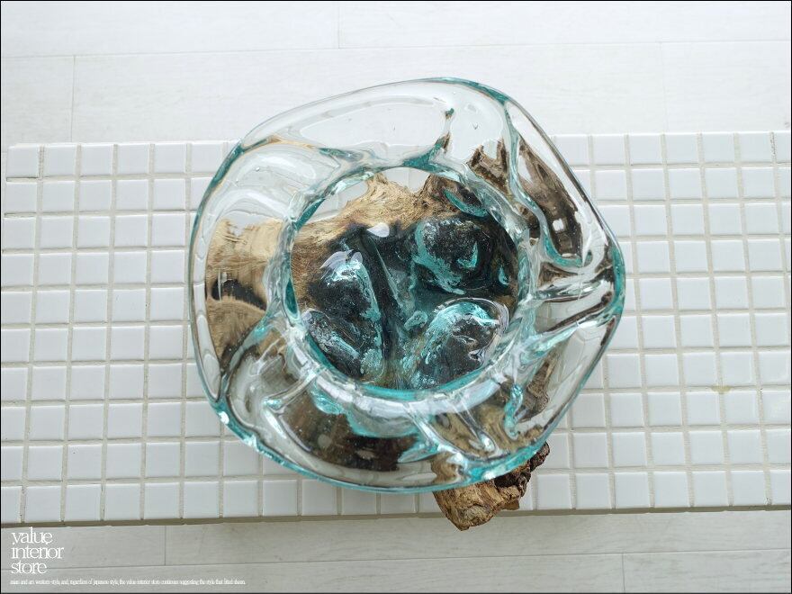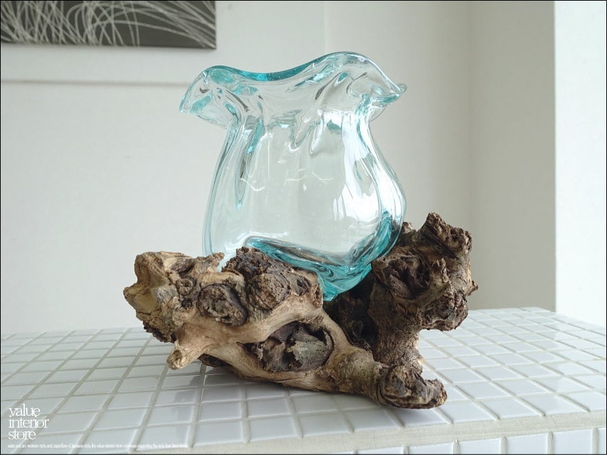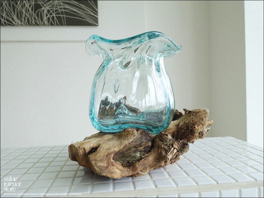 プリミティブな無垢材の土台に吹きガラスを合わせたフラワーベース。メダカ鉢にも良いサイズです。同じ形のものはなく、どちらの素材も大変個性的で味があります。