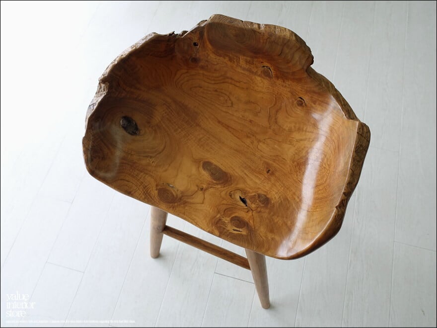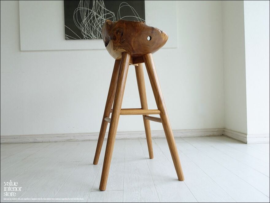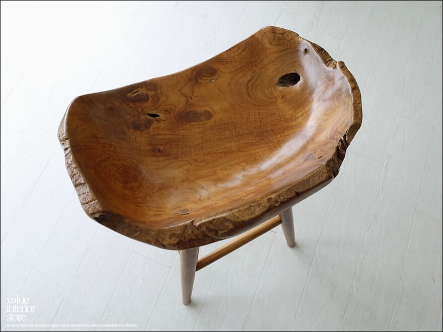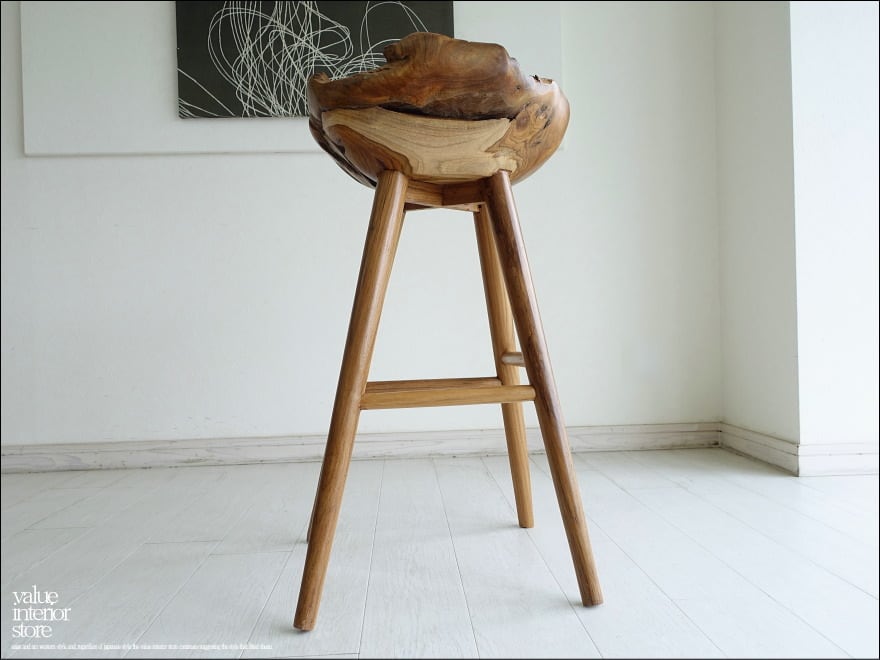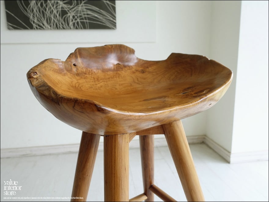 プリミティブな座面が何とも印象的なチーク総無垢材のバースツール。一つ一つ変化に富んだ木肌も素敵です。おしりを包み込むようにホールドしてくれるような座面の形は座り心地も良くお勧めです。