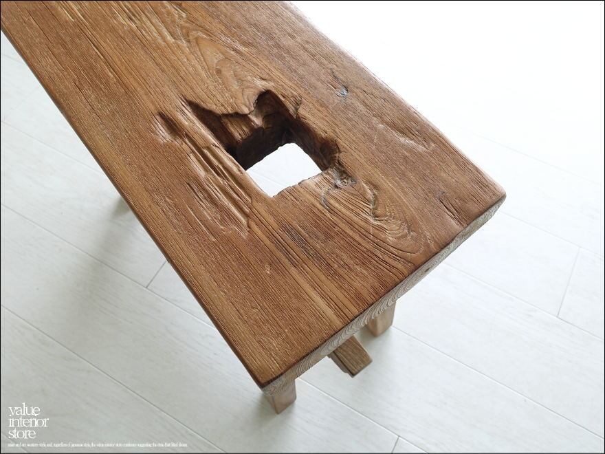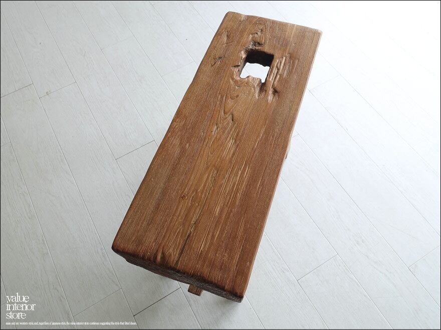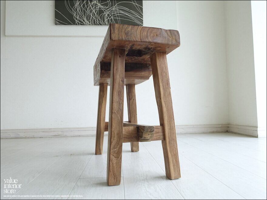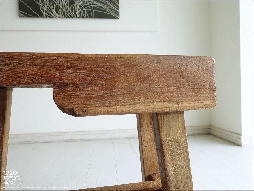 一枚板の座面は厚みもあり長くお使いいただけるしっかりした作りです。チークならではの木目と古材ならではの木肌が全体的に見られ味わい深く仕上がっています。職人さんが丹精こめて作った印象に溢れていて、きっとお部屋をスローダウンした素敵な雰囲気に包んでくれます。ベンチだけでなくインテリアのディスプレイ台としてもステキです。