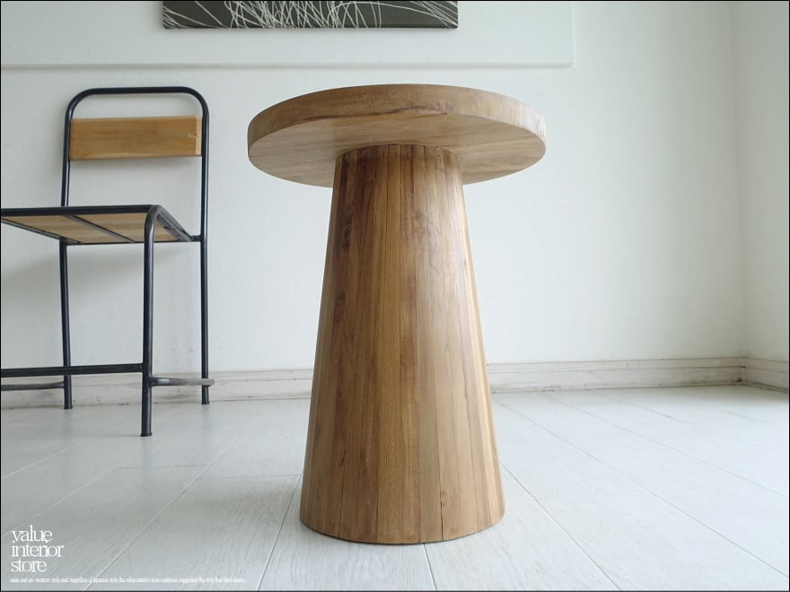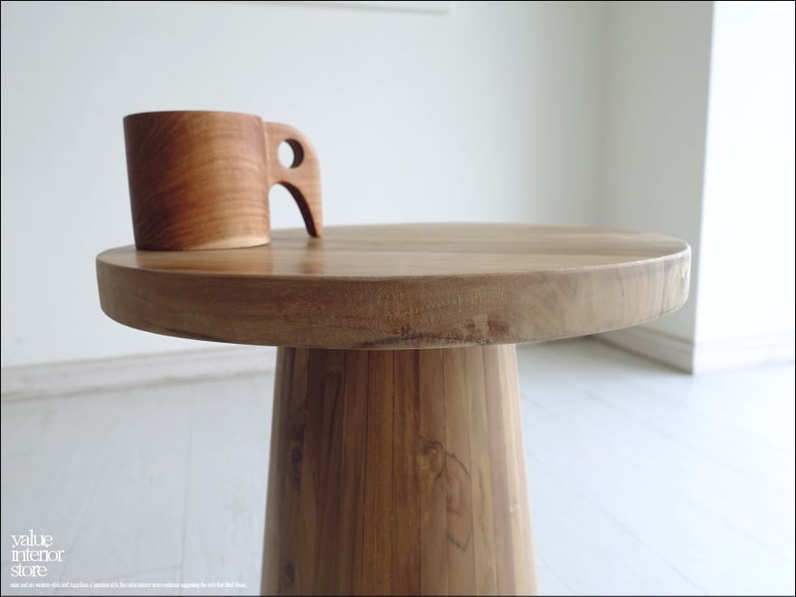 チークの硬く張りのある特徴が伝わってきて、脚と天板のバランスもとても上品です。無垢材のチークの良さを存分に楽しんでいただける、とてもステキなカフェテーブル。