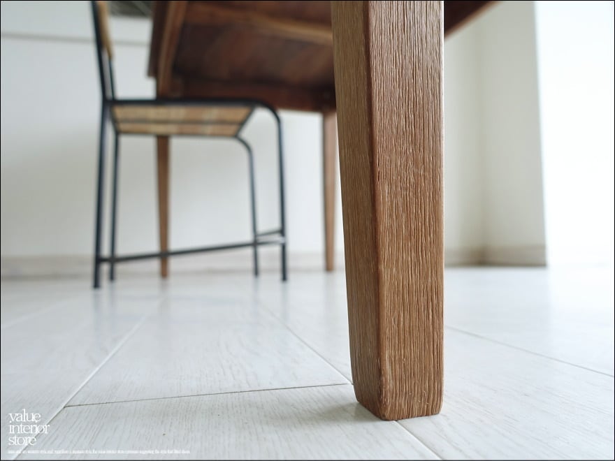 ビシッとした張りのあるチーク材の質感が見て取れる再生家具のダイニングテーブル。天板下から床まで徐々に細くなる細身の角脚とのバランスも良くシャープな印象です。独特の色合いで古いものならではの渋く落ち着いた雰囲気は、刻み込まれた歴史すら感じられるようです。