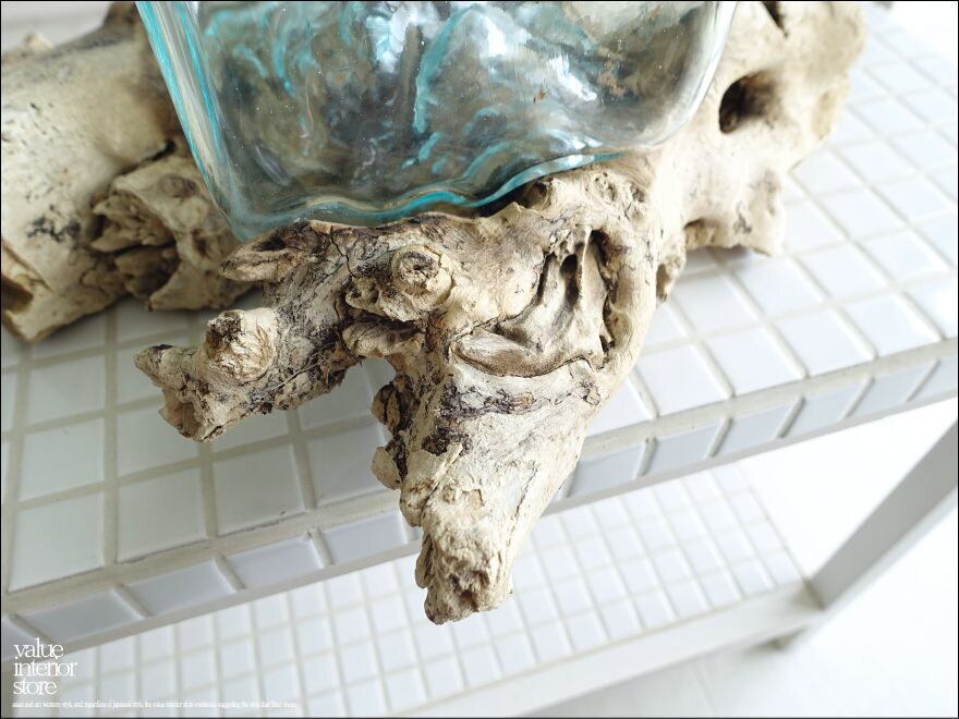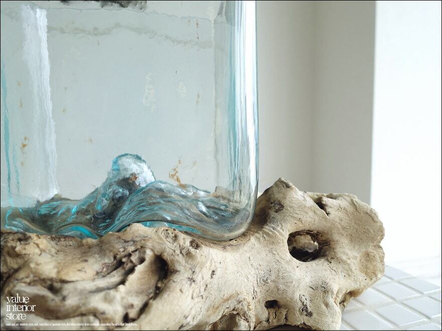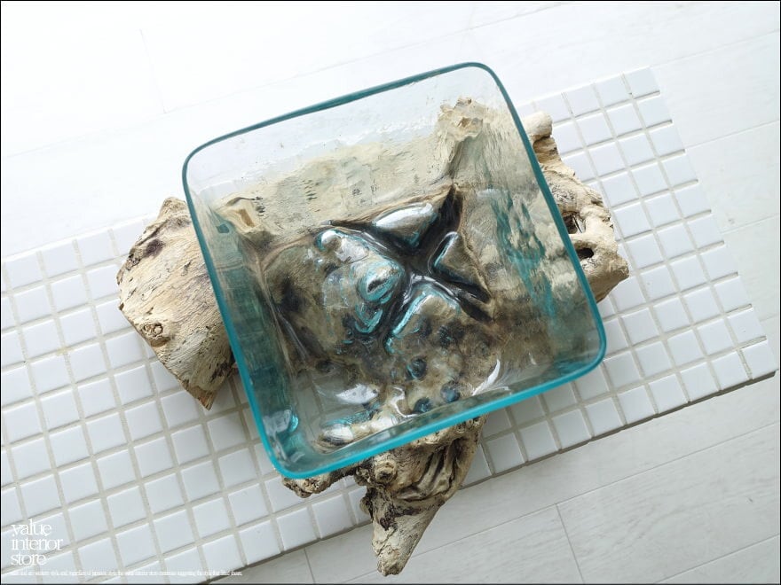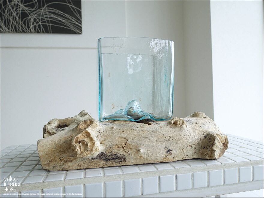 プリミティブな無垢材の土台に吹きガラスを合わせたフラワーベース。メダカ鉢にも良いサイズです。同じ形のものはなく、どちらの素材も大変個性的で味があります。