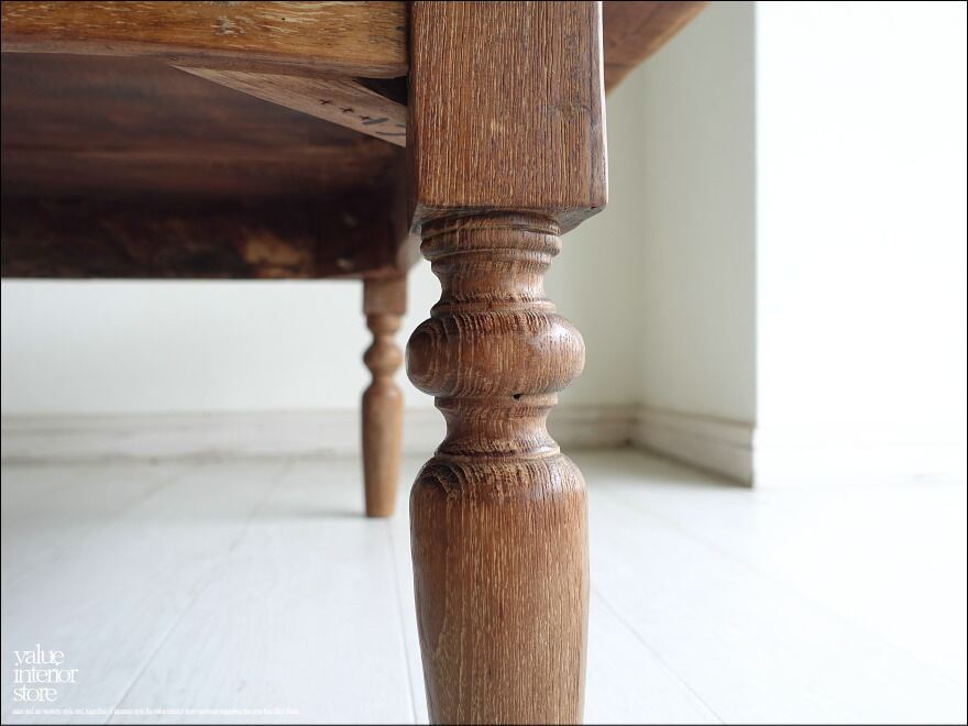この商品は、欠損箇所の補修、表面を全体的にワイヤーブラシで軽く削るラスティック仕上げをした後に、ワックスで仕上げていいる再生家具となります。元々の雰囲気は残して仕上げています。傷、ワレやフシ穴、色の濃淡、傾き、歪み、反り、汚れなどがございますが、素材や古いものの持つテイストとしてご理解をいただきますようお願い致します。