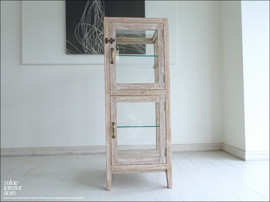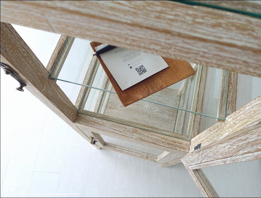 フレームは贅沢にチーク総無垢で、金具は真鍮製を使用いたしました。3面ガラスでどの角度からも中がキレイに見えますので、お店のショーケースとしてもお使いいただけます。また扉は上下2つに分かれていて上の扉には真鍮のロックも付いています。アンティークではありませんが古くからそこにあったような温か味のある仕上がりになっています。カフェなどのパン用ショーケース、食器棚、小物のディスプレイなど幅広くお使いください。