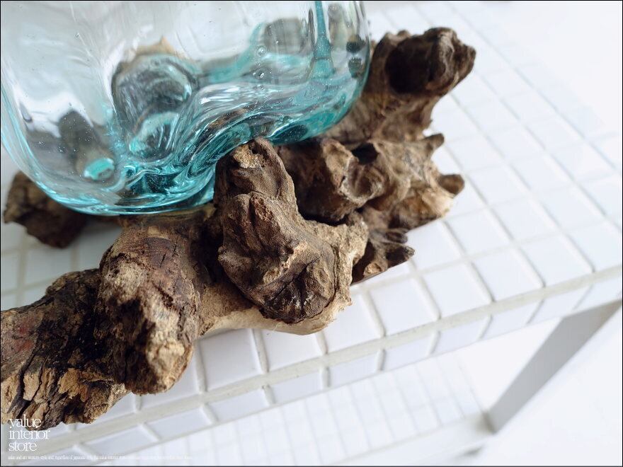 プリミティブな無垢材の土台に吹きガラスを合わせたフラワーベース。メダカ鉢にも良いサイズです。同じ形のものはなく、どちらの素材も大変個性的で味があります。