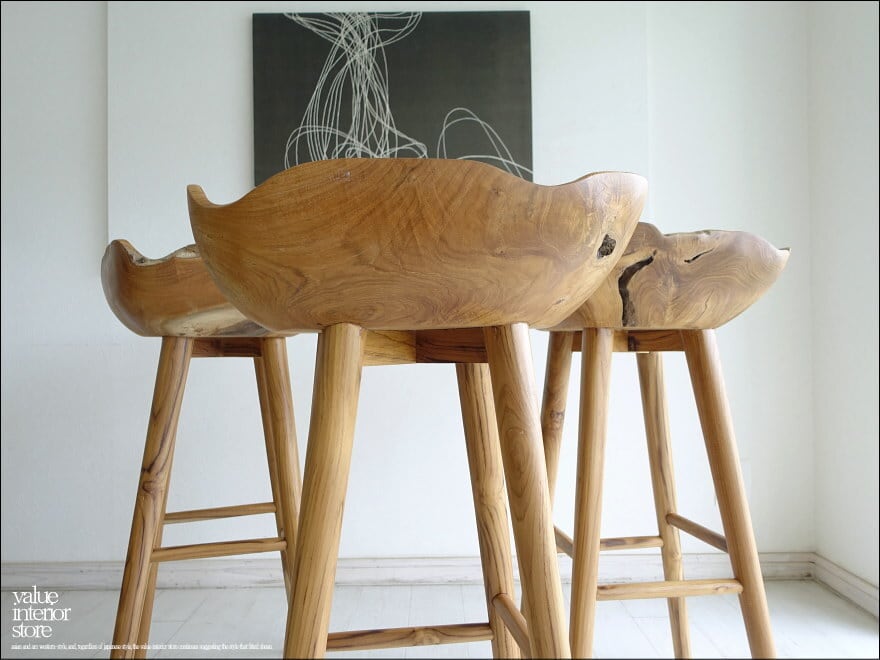プリミティブな座面が何とも印象的なチーク総無垢材のバースツール。一つ一つ変化に富んだ木肌も素敵です。おしりを包み込むようにホールドしてくれるような座面の形は座り心地も良くお勧めです。