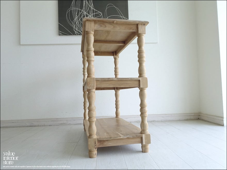 ナチュラルで素朴な質感は、経年変化でいわゆるチーク色へ徐々に変化していくところも楽しみの一つです。余分な装飾を無くしたシンプルな棚板と、丸く柔らかな印象の脚とのバランスがとってもかわいいですよ♪