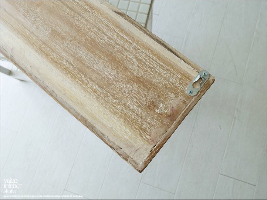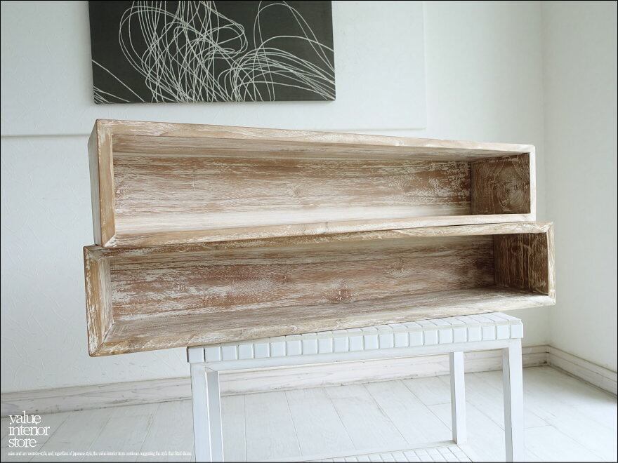 表面はワイヤーブラシで軽く削ってから白色を塗布した後に、サイディングするシャビーな質感に仕上がっているチークウォールシェルフ。幅は約88cmある大きめのウォールシェルフで、ボックス内とその上の両方に物を置くことができます。程よいサイズで場所に合わせて配置しやすく便利にお使い頂けます。幅広いテイストのインテリアと相性良くコーディネートできますのでお気に入りスペースでお使いください。