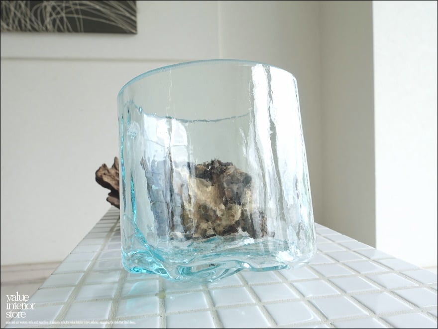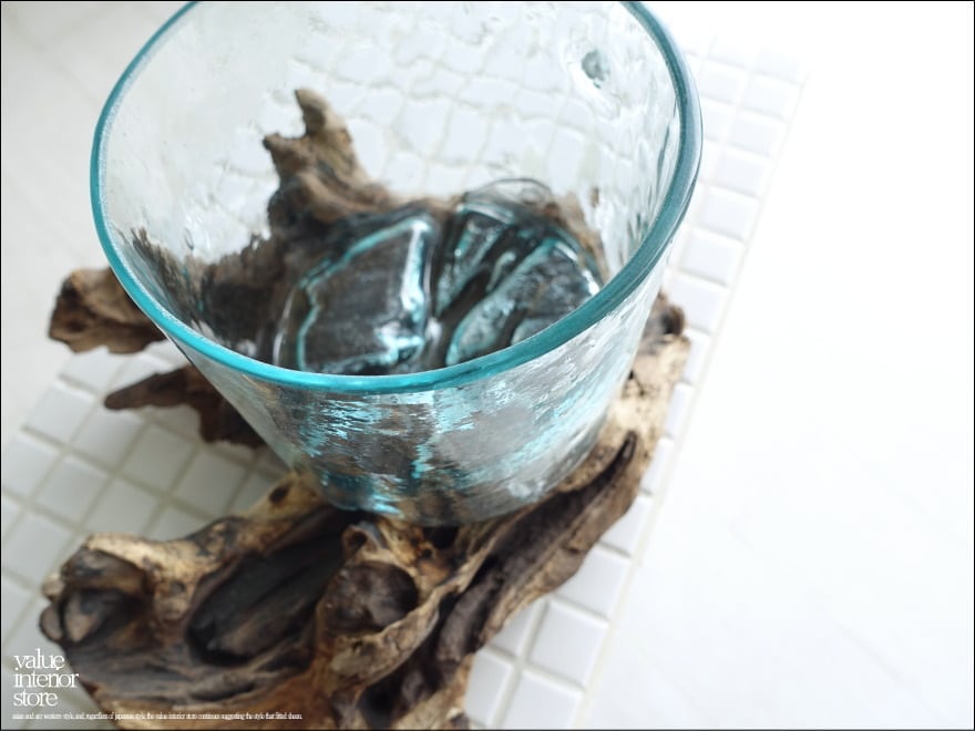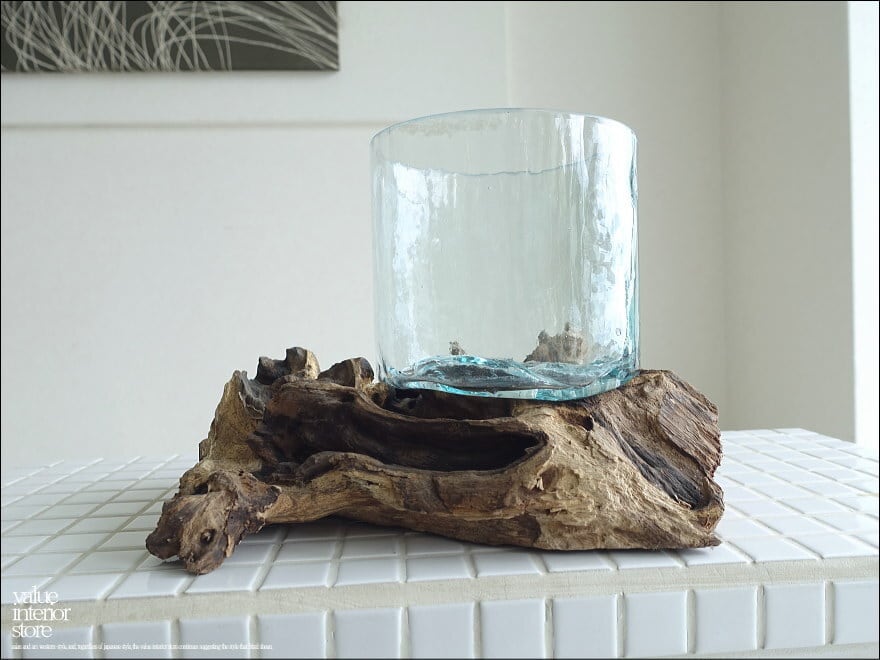 プリミティブな無垢材の土台に吹きガラスを合わせたフラワーベース。メダカ鉢にも良いサイズです。同じ形のものはなく、どちらの素材も大変個性的で味があります。