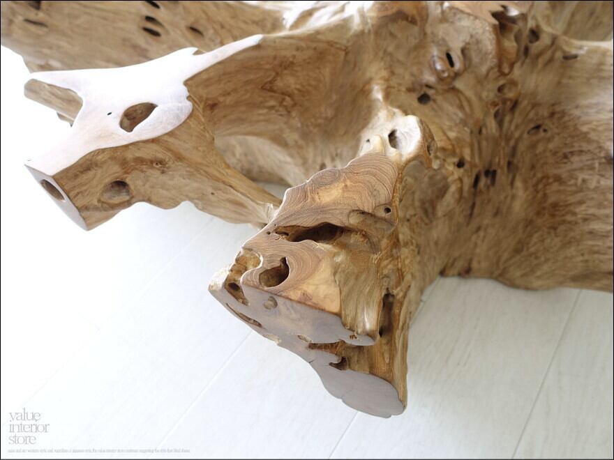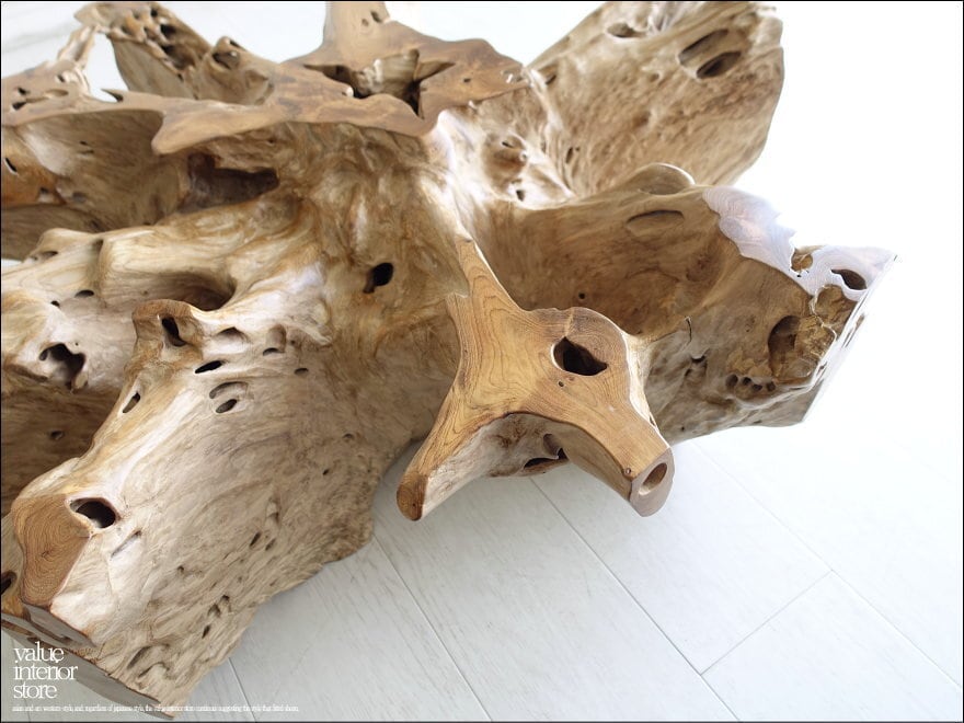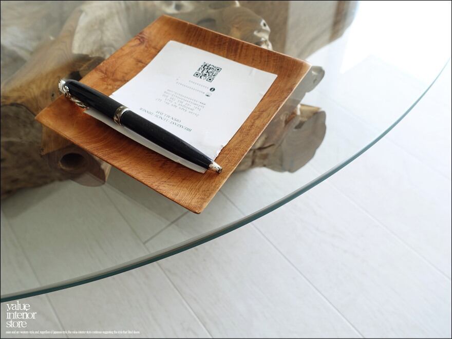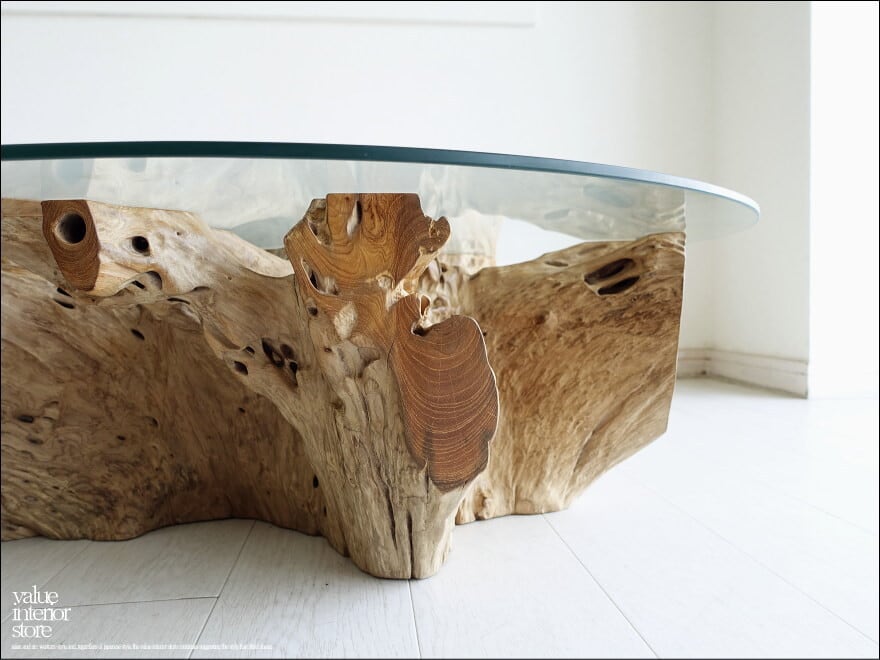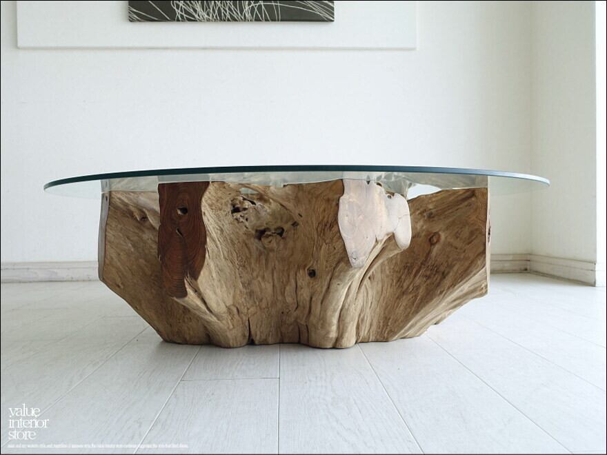 チークの根本をテーブルに使った自然な様の変化に富んだ形が素敵なガラステーブル。