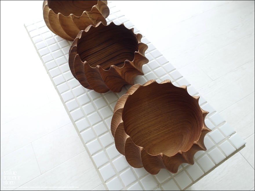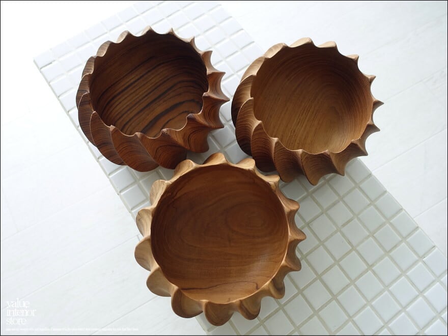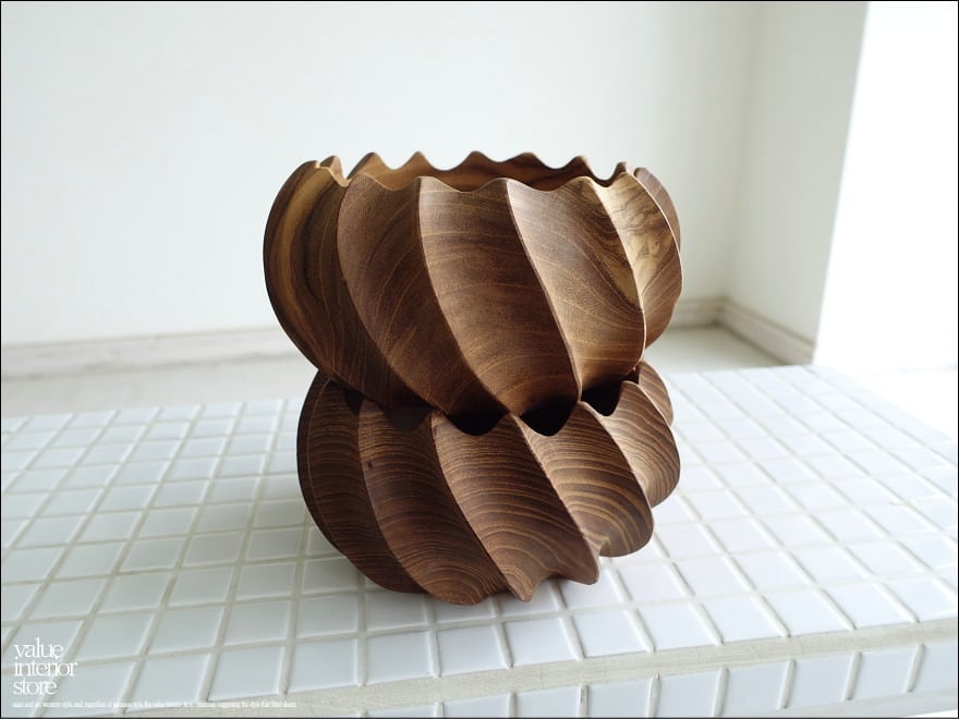 チーク材独特の個性的な木目が美しいチークスパイラルボウル。螺旋状に削り取った曲線のラインが目を引き、お料理を一層盛り立ててくれます。一つ一つ削り取って製作しますので、厚みがあり手作りならではの滑らかな仕上がりで口当たりの良さが魅力的です。毎日の食卓のアクセントづくりにぜひお役立てください。表面はミネラルオイル(ライム油・大豆油・チョウジ油・ナツメグ油)仕上げで、サラダボウルなどの食器としてもお使いいただけます。(食品等輸入届出書提出済)