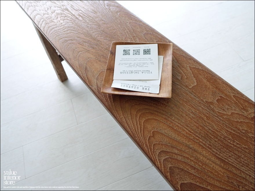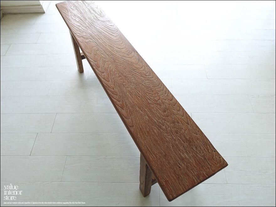 オールドチークならではの味のある雰囲気が魅力のベンチ。一枚板の座面は厚みもあり長くお使いいただけるしっかりした作りです。チークならではの荒々しさと、古材ならではの変化に富んだ木肌が全体的に見られ味わい深く仕上がっています。職人さんが丹精こめて作った印象に溢れていて、きっとお部屋をスローダウンした素敵な雰囲気に包んでくれます。ベンチだけでなくインテリアのディスプレイ台としてもステキです。