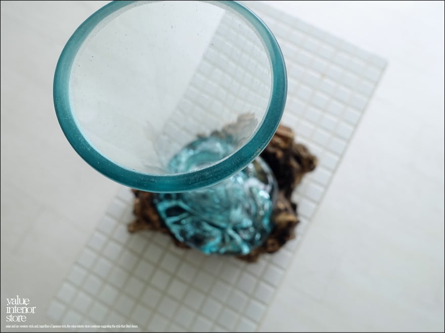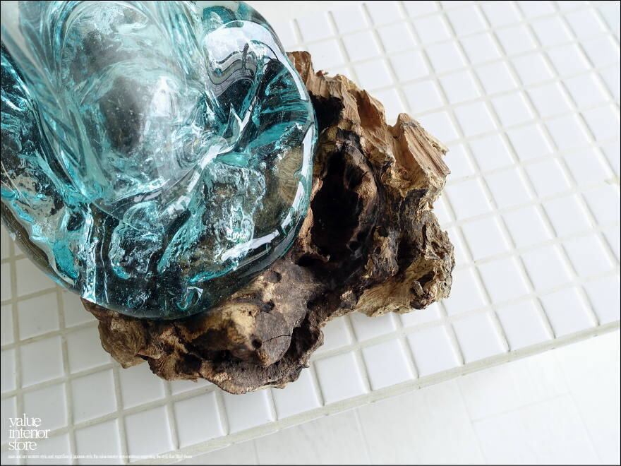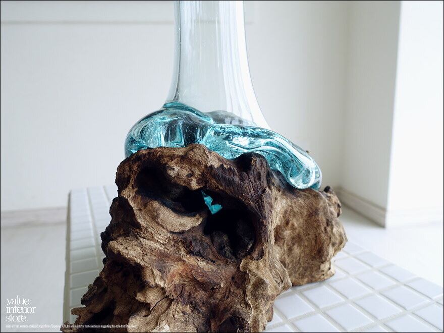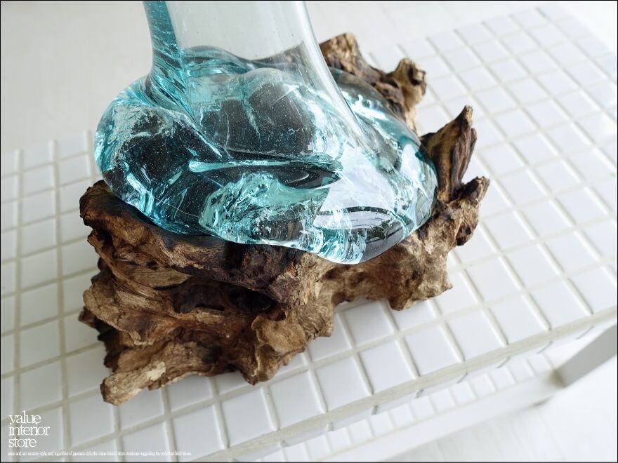 プリミティブな無垢材の土台に吹きガラスを合わせたフラワーベース。一点一点手作りで同じ形のものはなく、どちらの素材も大変個性的で味があります。主役のお花を自然に引き立たせてくれます。