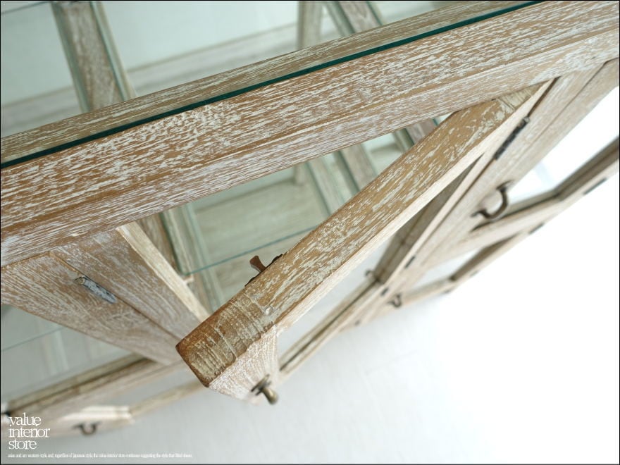 ワイヤーブラシで無垢材の表面に凹凸をつけ、凹みに白色を残した独特の表面仕上のガラスケース。