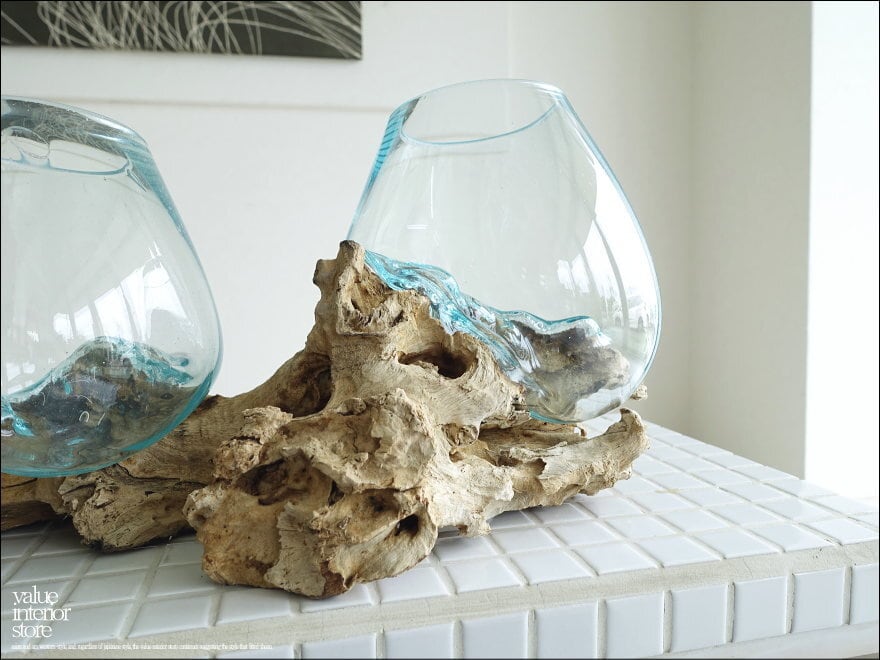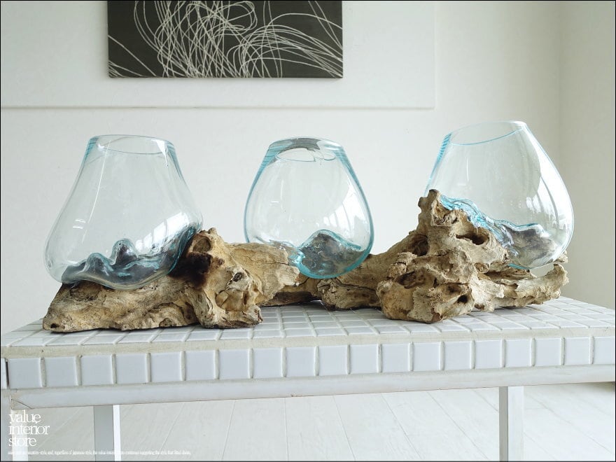プリミティブな無垢材の土台に吹きガラスを合わせた三連のフラワーベース。メダカ鉢にも良いサイズです。一点一点手作りで同じ形のものはなく、どちらの素材も大変個性的で味があります。