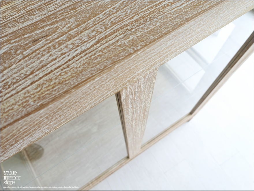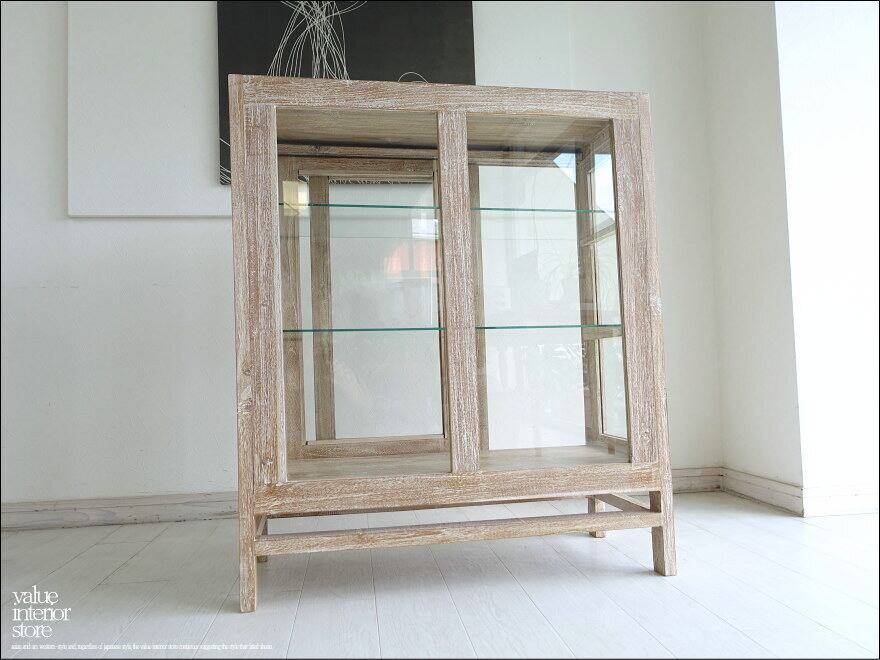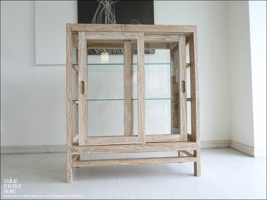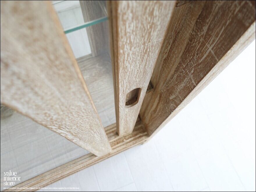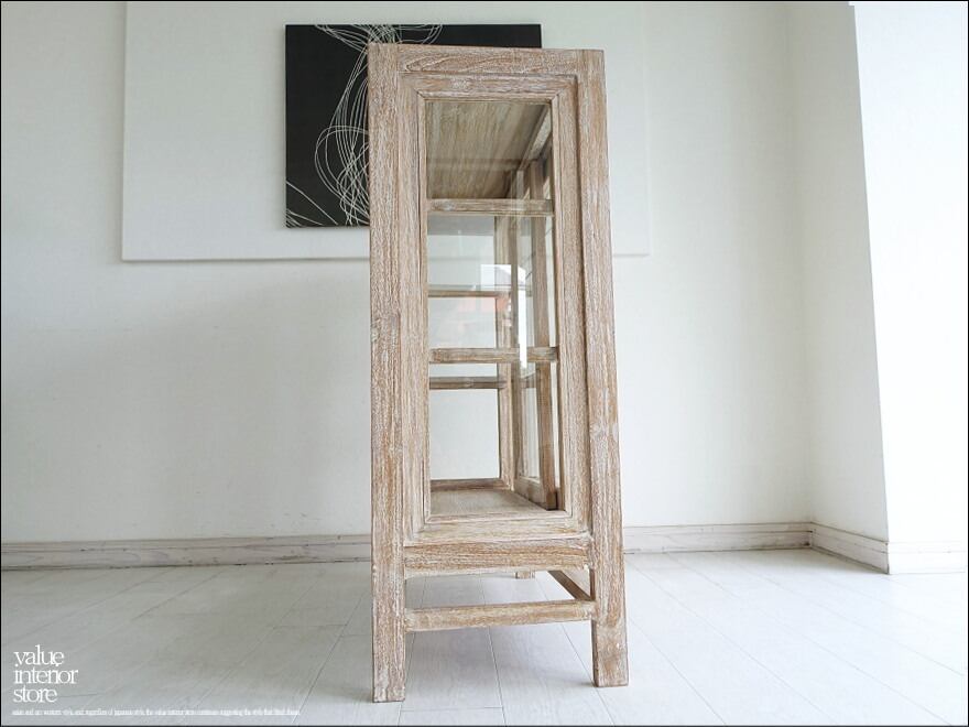 4面ガラス仕様で光が入りやすく、中に収納するものもディスプレイするような感覚で飾りたくなります。ナチュラルで個性的な木目が広がっており、チーク材の持ち味の硬さや張りの強さが感じられます。お店のショーケースとしてもぜひお使いください。