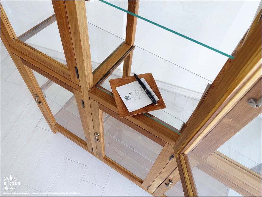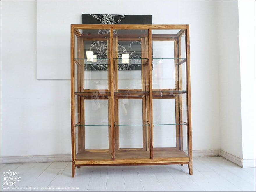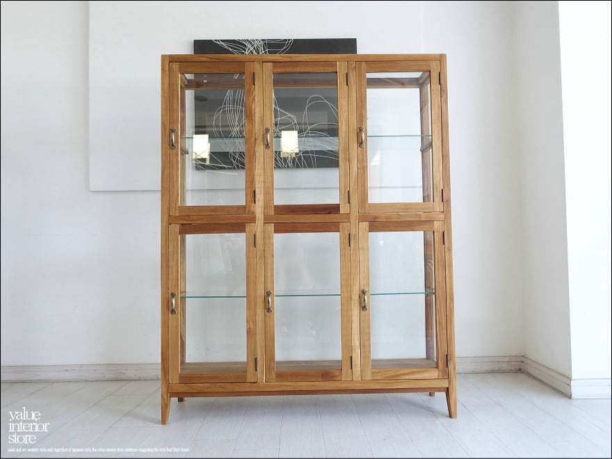 フレームはチーク総無垢材で金具は真鍮製を使用いたしました。ガラス面が多くどの角度からも中がキレイに見えますので、お店のショーケースとしてもお使いいただけます。また扉は6箇所ありますが、中は仕切りの無い空間ですので用途に合わせて自由に使えます。アンティークではありませんが古くからそこにあったような温か味のある仕上がりになっています。カフェなどのパン用ショーケース、食器棚、小物のディスプレイなど幅広くお使いください。