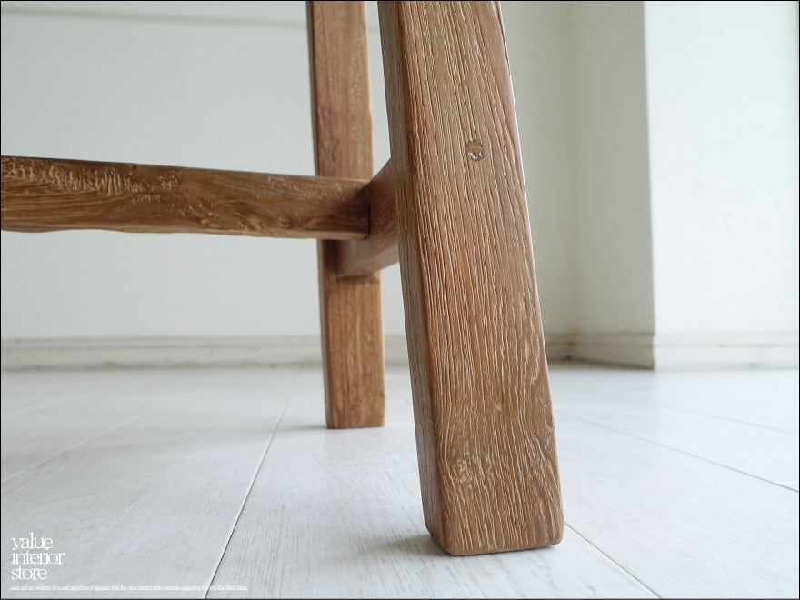 オールドチークならではの渋く落ち着いた雰囲気を持つ角型スツール。座面にはチーク材の個性的な木肌が現れています。角型の脚をさらにH字にそれぞれの脚をつなぐフレームを取り付けていますので、とてもしっかりとした頑丈な作りです。表面はワイヤーブラシで削り取ることで無垢材の素朴な質感を一層引き立たせています。