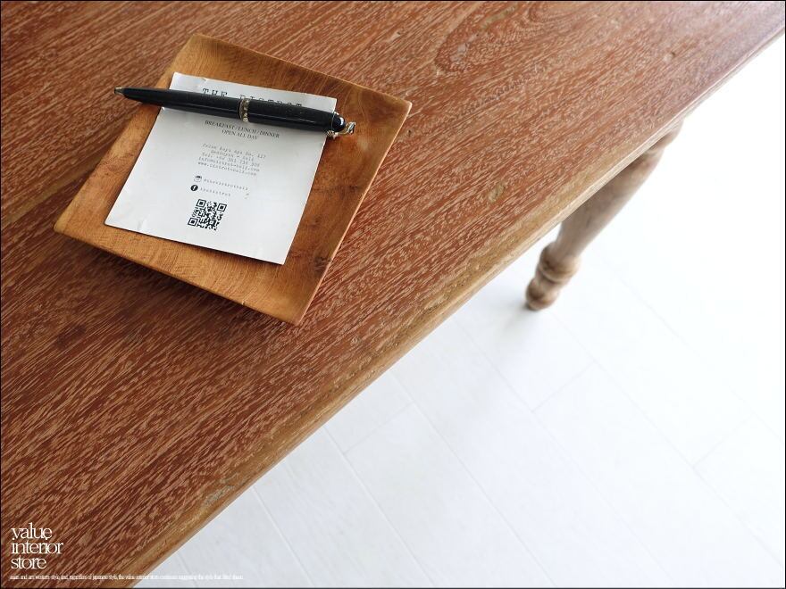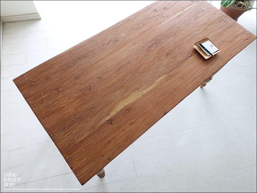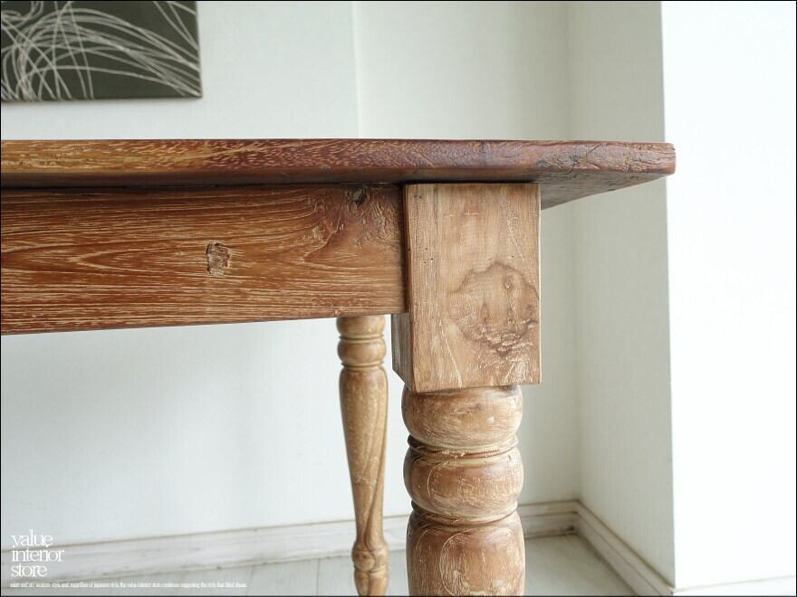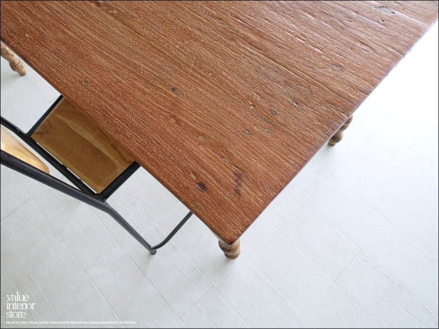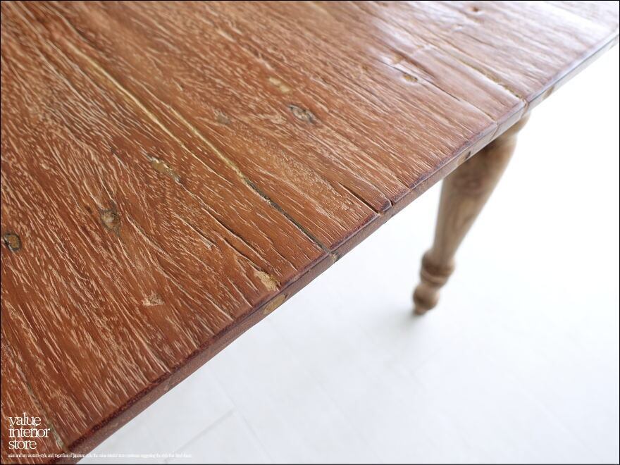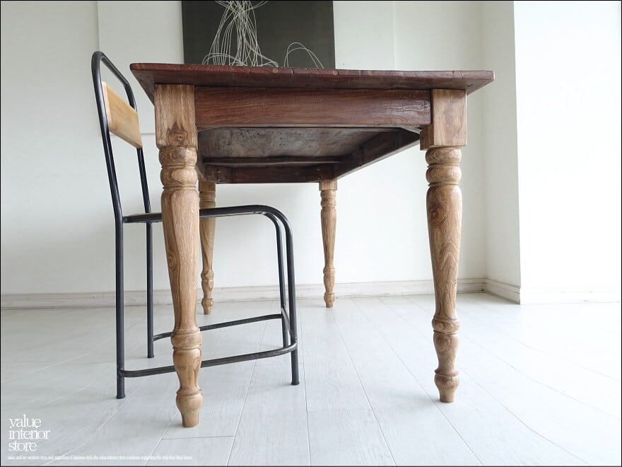 ビシッとした張りのあるチーク材の質感が見て取れる再生家具のダイニングテーブル。丸く飾り彫りを付けた脚が柔らかな印象です。独特の色合いで古いものならではの渋く落ち着いた雰囲気は、刻み込まれた歴史すら感じられるようです。