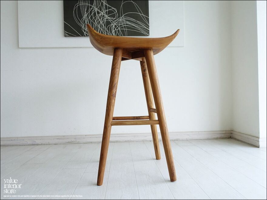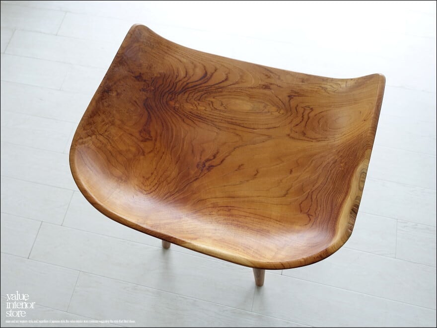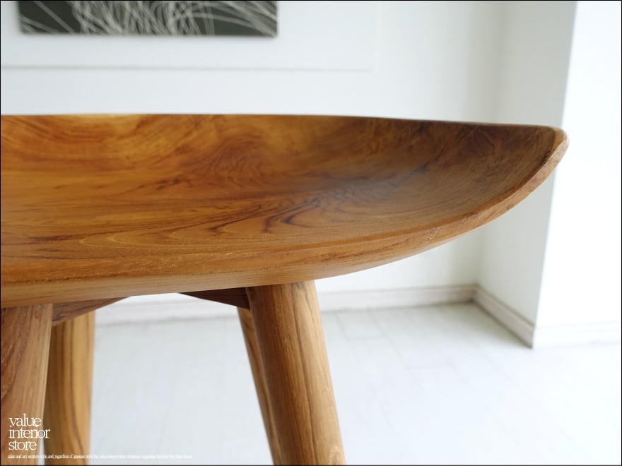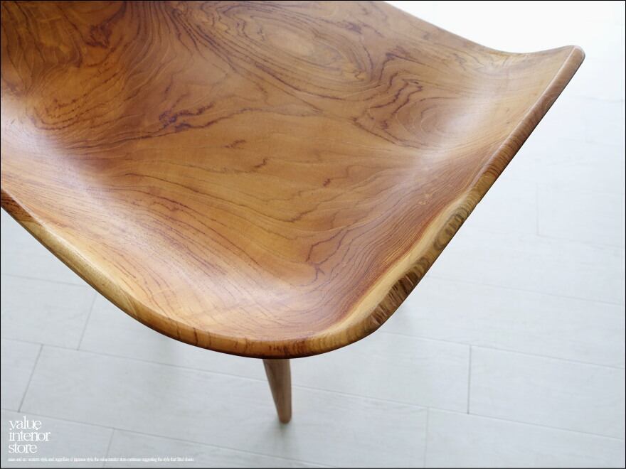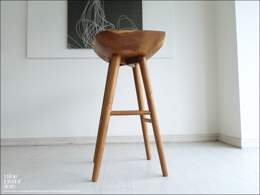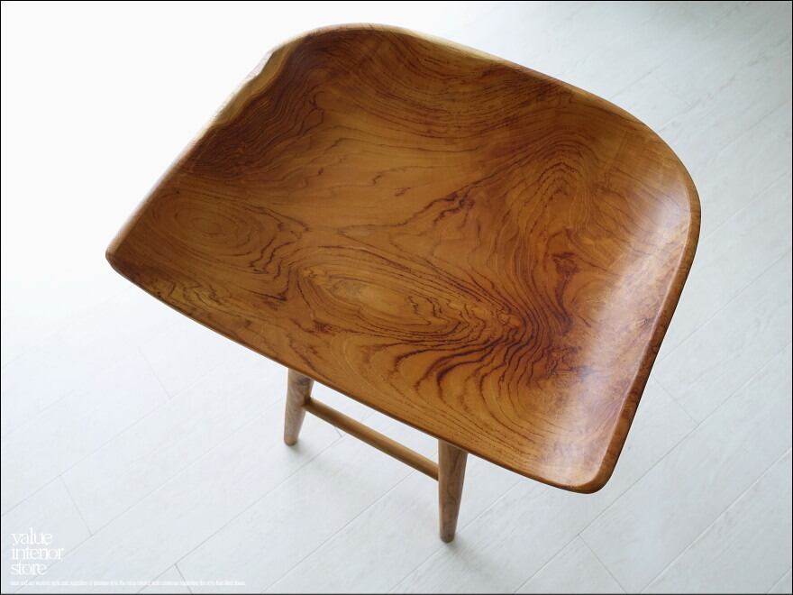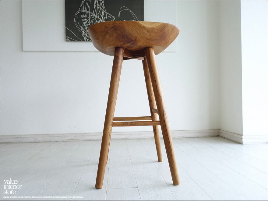 プリミティブな座面が何とも印象的なチーク総無垢材のバースツール。一つ一つ変化に富んだ木肌も素敵です。おしりを包み込むようにホールドしてくれるような座面の形は座り心地も良くお勧めです。