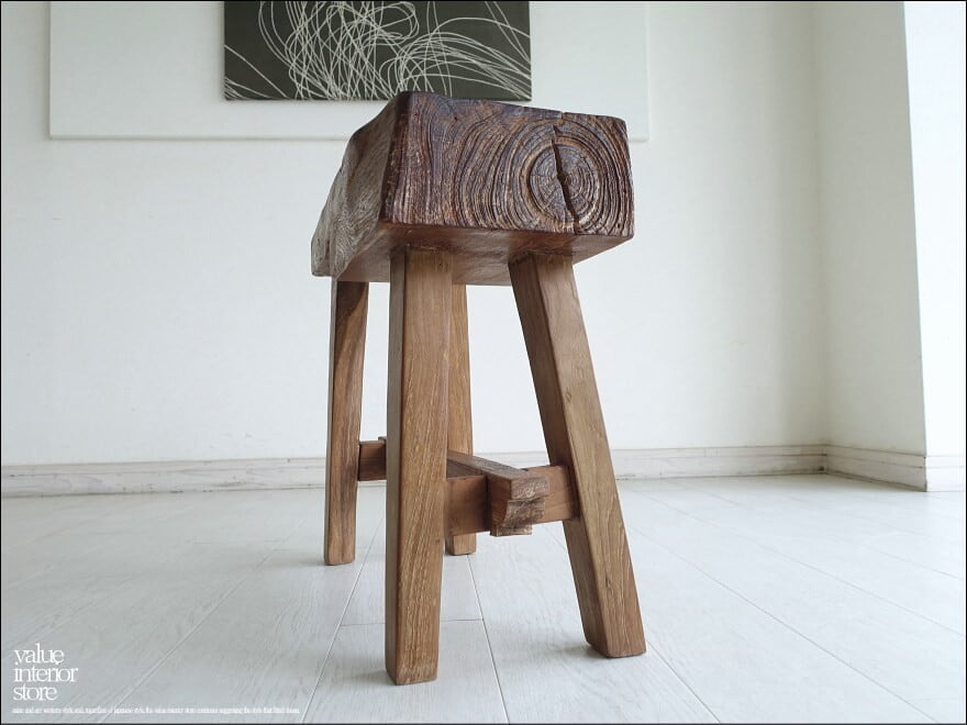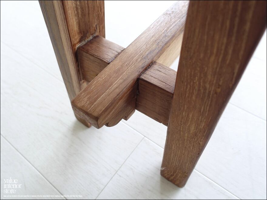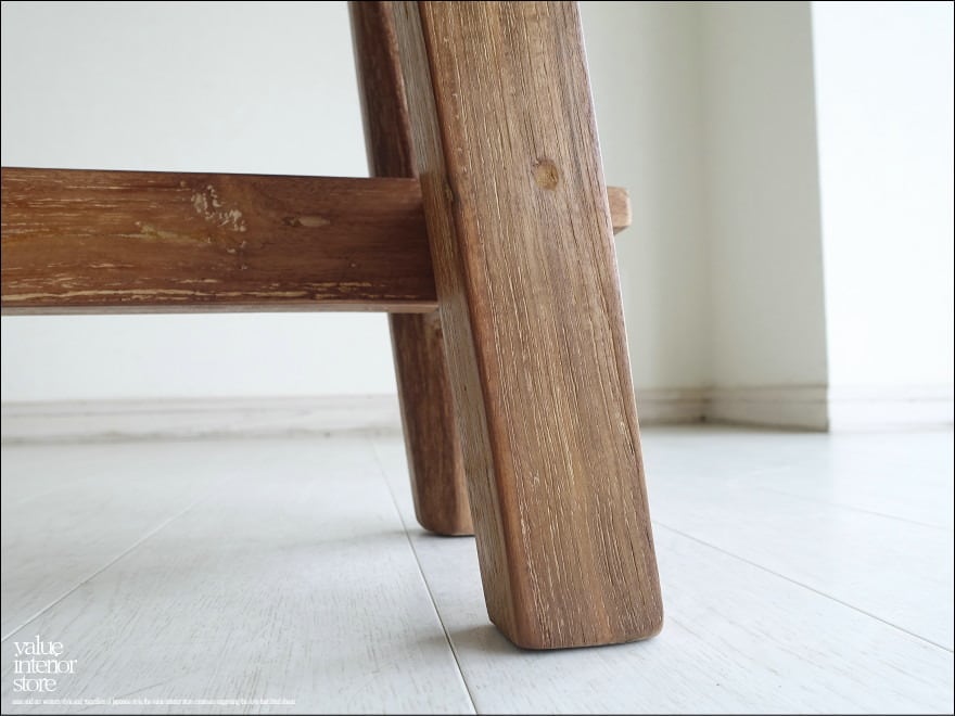 一枚板の座面は厚みもあり長くお使いいただけるしっかりした作りです。チークならではの木目と古材ならではの木肌が全体的に見られ味わい深く仕上がっています。職人さんが丹精こめて作った印象に溢れていて、きっとお部屋をスローダウンした素敵な雰囲気に包んでくれます。ベンチだけでなくインテリアのディスプレイ台としてもステキです。