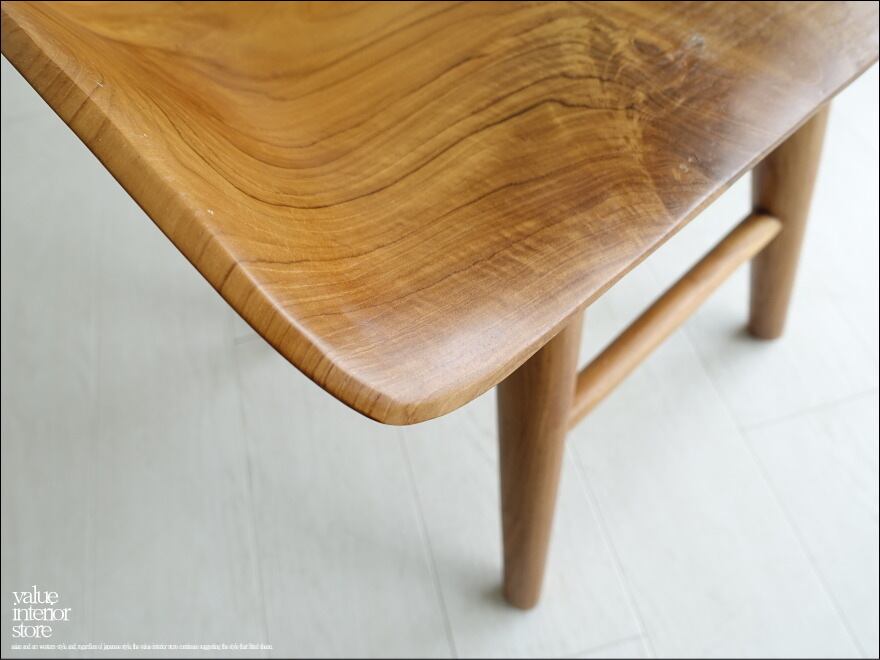 プリミティブな座面が何とも印象的なチーク総無垢材のチェア。チーク座独特の変化に富んだ木肌が素敵です。おしりを包み込むようにホールドしてくれるような座面の形は座り心地も良くお勧めです。