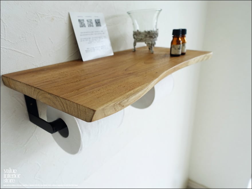 プリミティブなチーク無垢の棚板のついたトイレットペーパーホルダー。板の厚みも十分にあり、どっしりと存在感があります。2つのペーパーを設置でき、ペーパーは横からサッと通すだけの簡単セットなので便利ですよ。棚板にはお気に入りのインテリア小物やグリーンなどを飾ると素敵です。プライベートルームにもこだわりのインテリアをぜひこの機会にどうぞ。