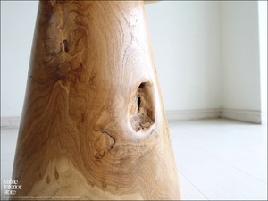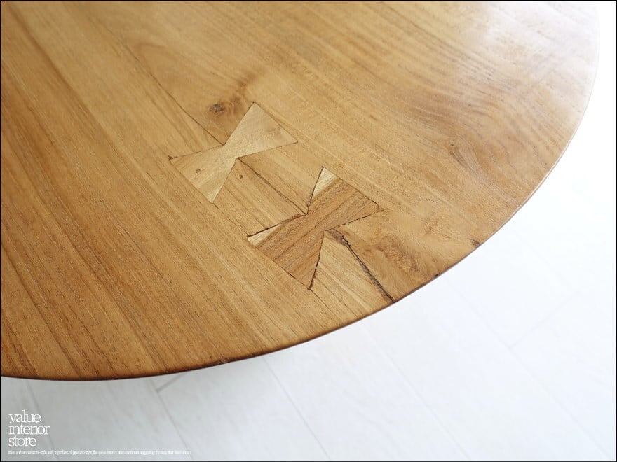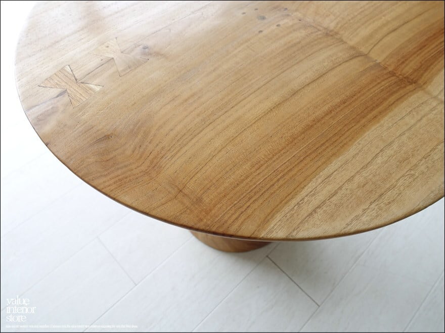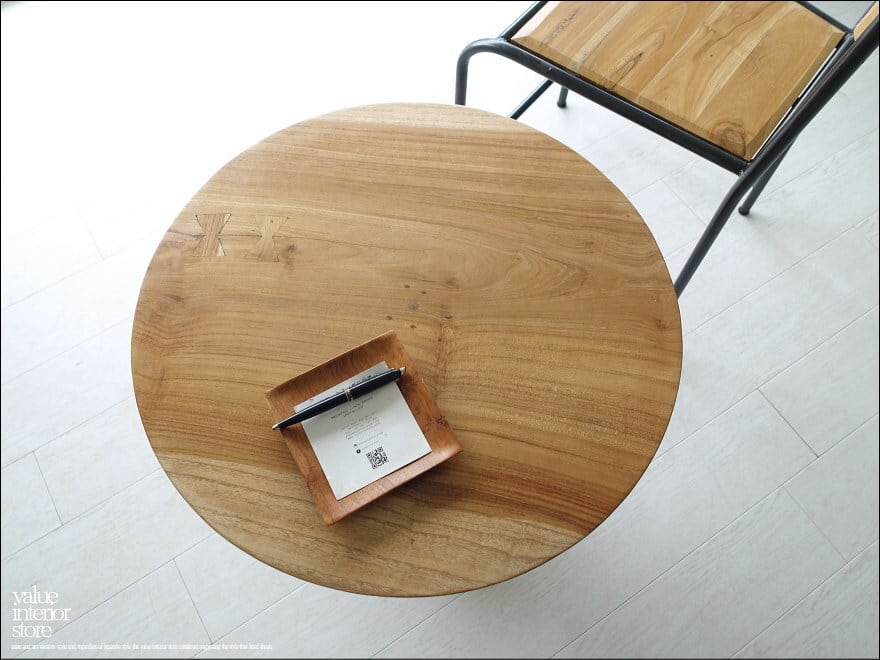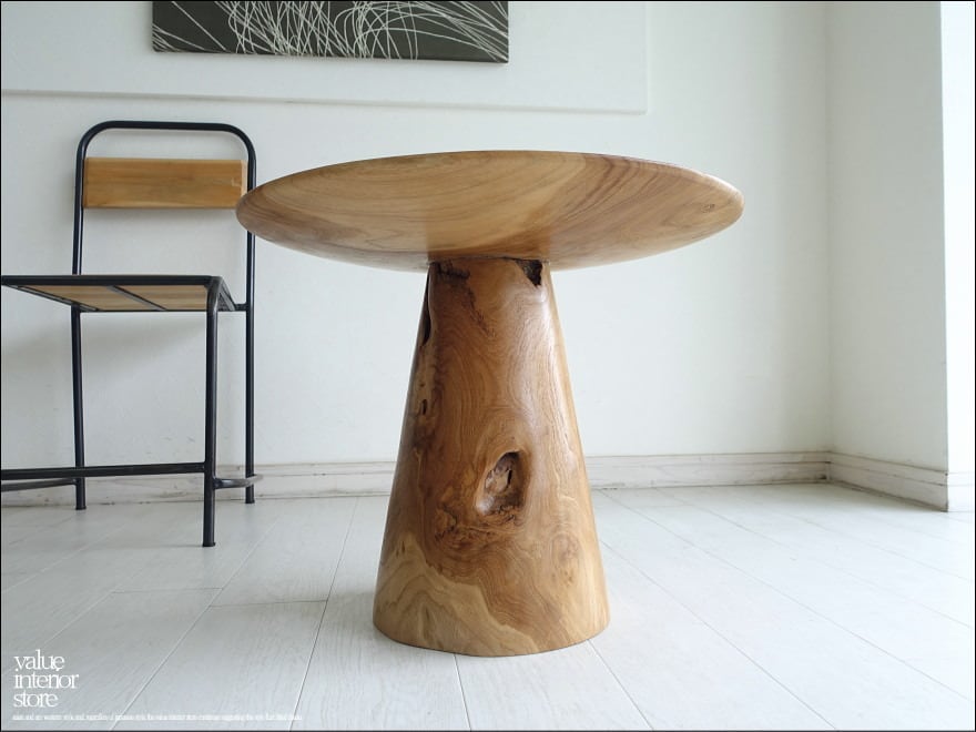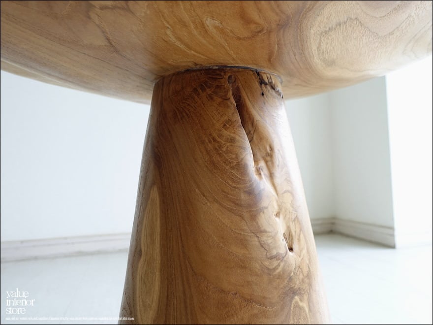円形の厚みのある一枚板の天板に、削り出して製作したプリミティブな脚を組み合わせた総無垢材のチークサイドテーブル。一点物で、重さは約17kgあります。チーク材の硬く張りのある特徴が伝わってきて、素材の良さを十分に堪能いただける自然溢れる素敵なサイドテーブルで、ひび割れた個所に設置した“千切り”と呼ばれる加工もアクセントになっています。