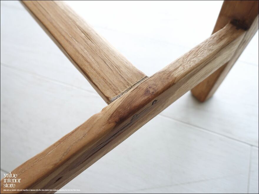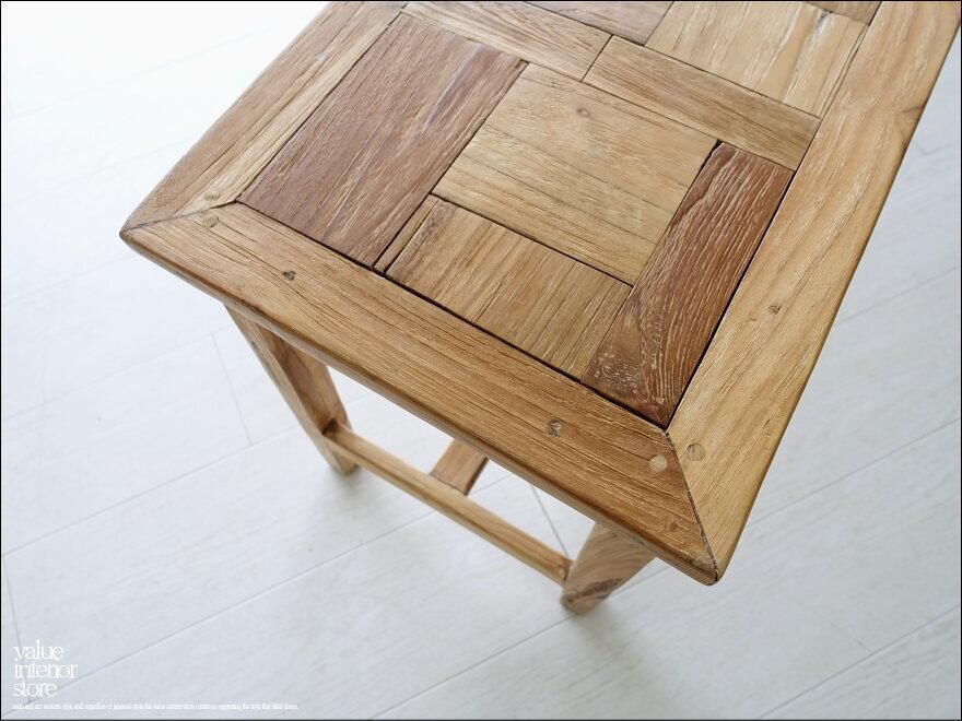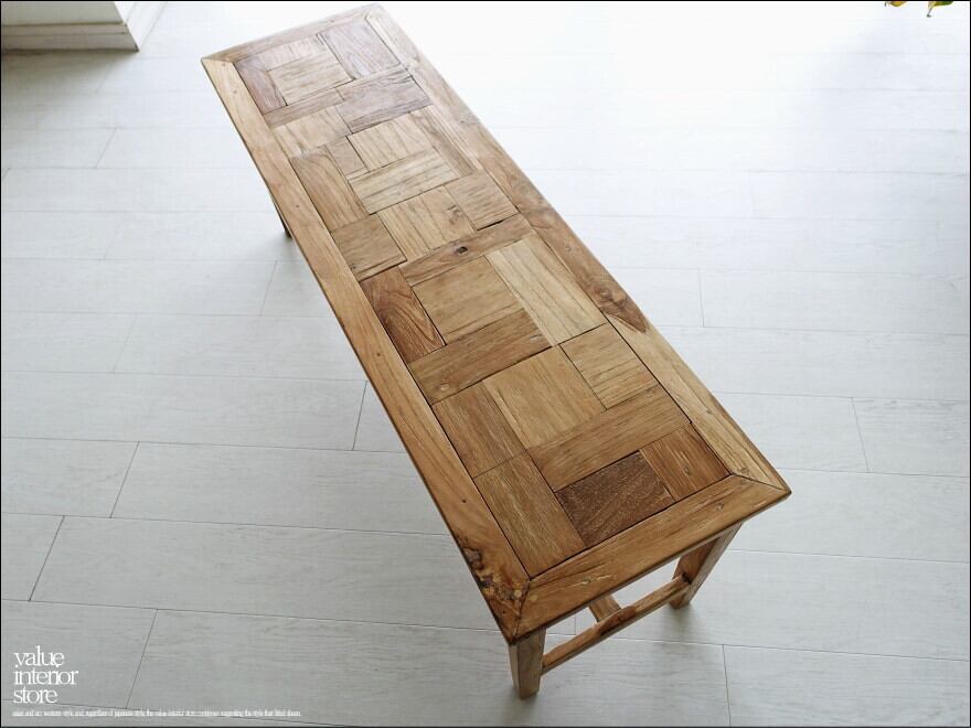 オールドチークならではの味のある雰囲気が魅力のベンチ。タイル状に端材を組み合わせたデザインが素敵です。チークならではの荒々しさと、古材ならではの変化に富んだ木肌が全体的に見られ味わい深く仕上がっており、きっとお部屋をスローダウンした素敵な雰囲気に包んでくれます。ベンチだけでなくインテリアのディスプレイ台としてもステキです。