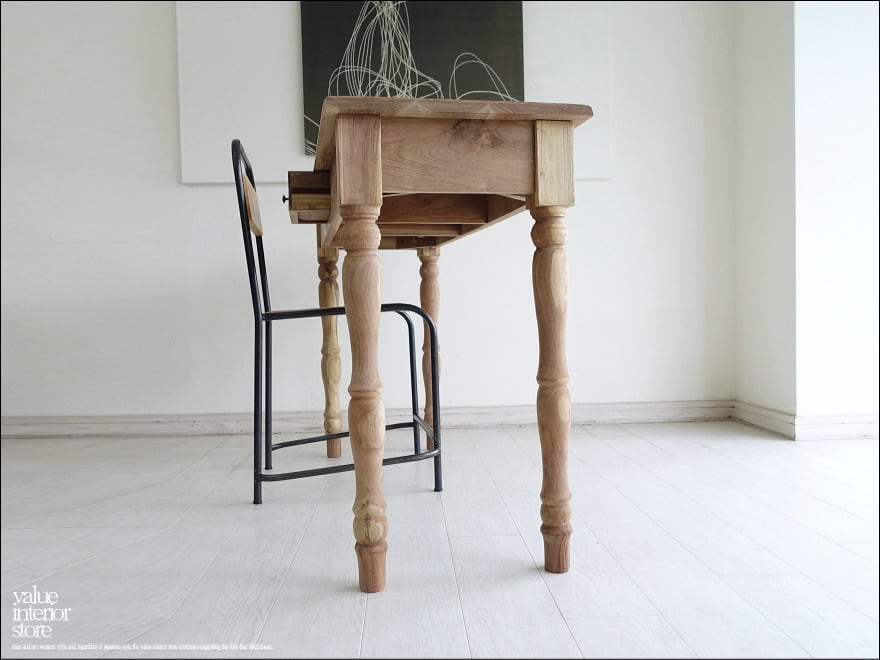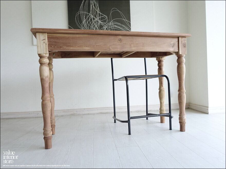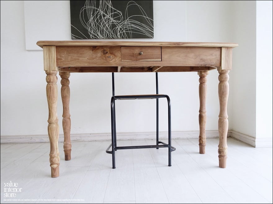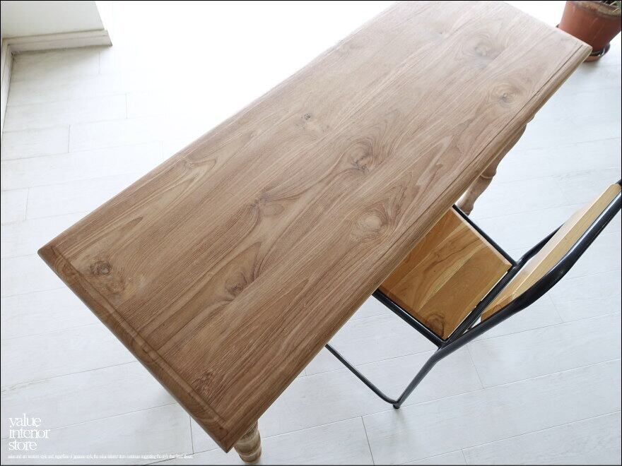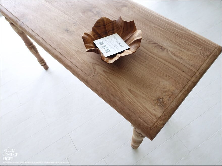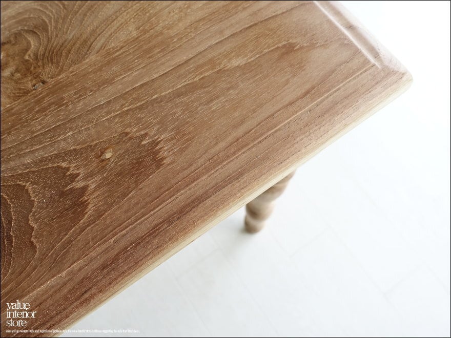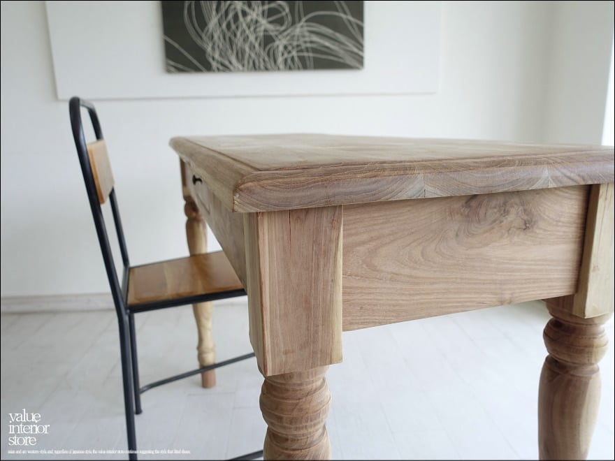 チーク材独特の色合いで、渋く落ち着いた雰囲気が感じられます。存在感がありゆったりとして、職人さんが丹精こめて作った印象に溢れています。このテーブルに向かうと自然と気持ちまで落ち着くようです。西洋、アジアン、和風モダン、北欧など幅広いテイストのインテリアと相性良くコーディネートできますのでお気に入りスペースでお使いください。