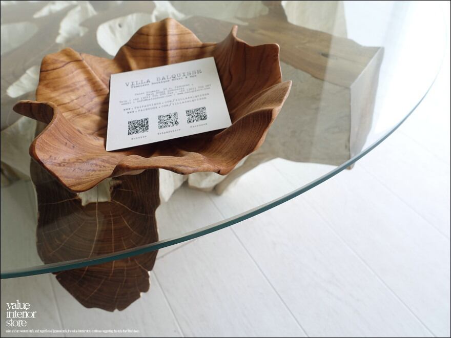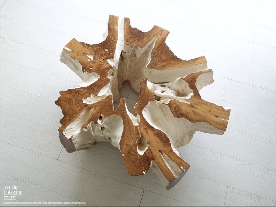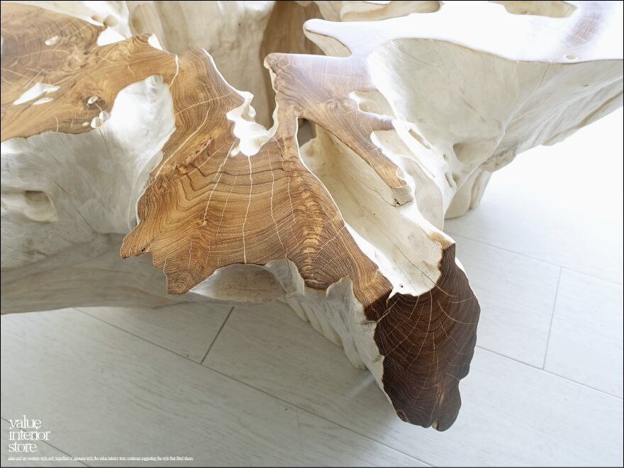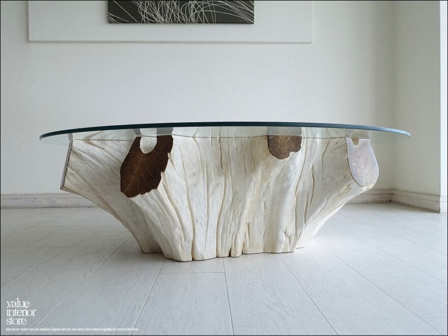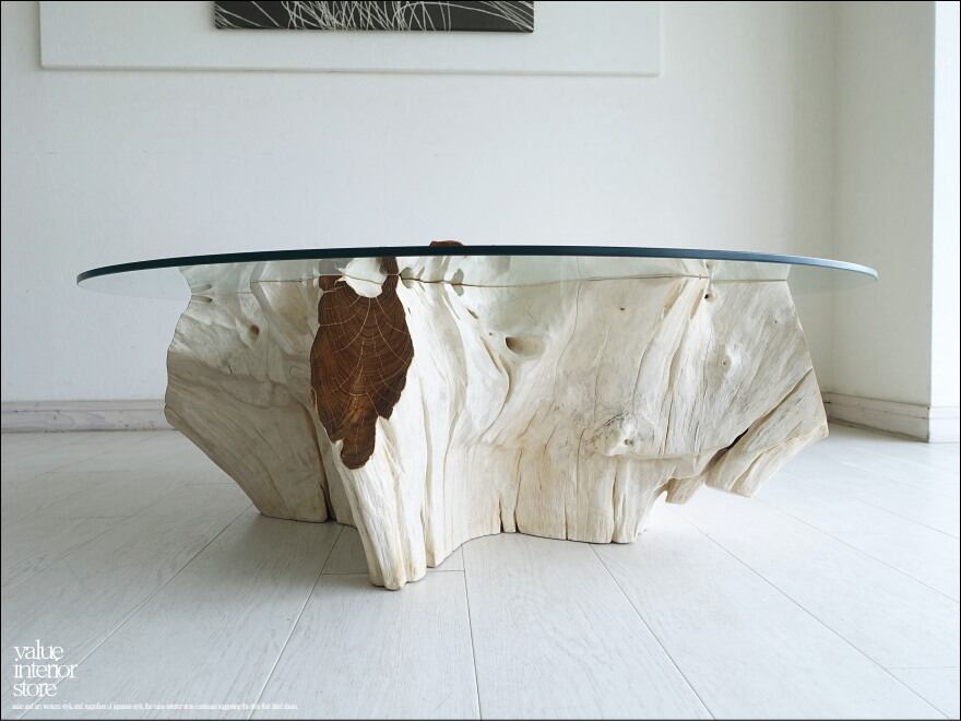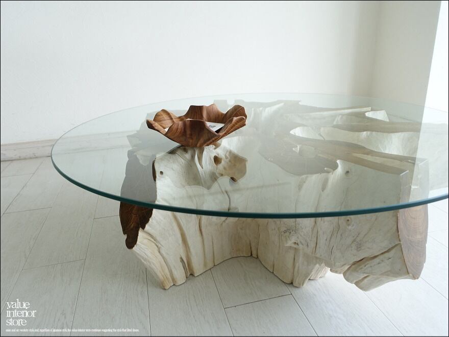 チークの根本をテーブルに使った何ともプリミティブなガラステーブル。