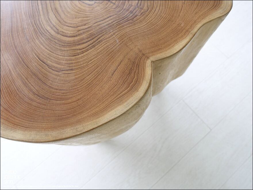 塊!? と、思わせるプリミティブなチーク総無垢材のスツール。樹齢を見て取れる細かく入った年輪は、岩場多いジャワ島中部の山岳地帯で採れた良質のチーク材の証となっています。内部よりは比較的に柔らかな部分とされる樹皮に近い側面の部分も、そのままに仕上げていますが、カチカチな手触りから乾燥状態も十分で、その硬さを忘れさせてくれそうな柔らかな木肌となっています。